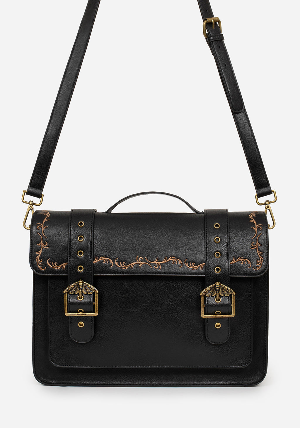 • Black Faux Leather Vine Embroidered Crossbody Satchel Bag