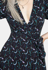 - Black moth & moon print midi wrap dress
