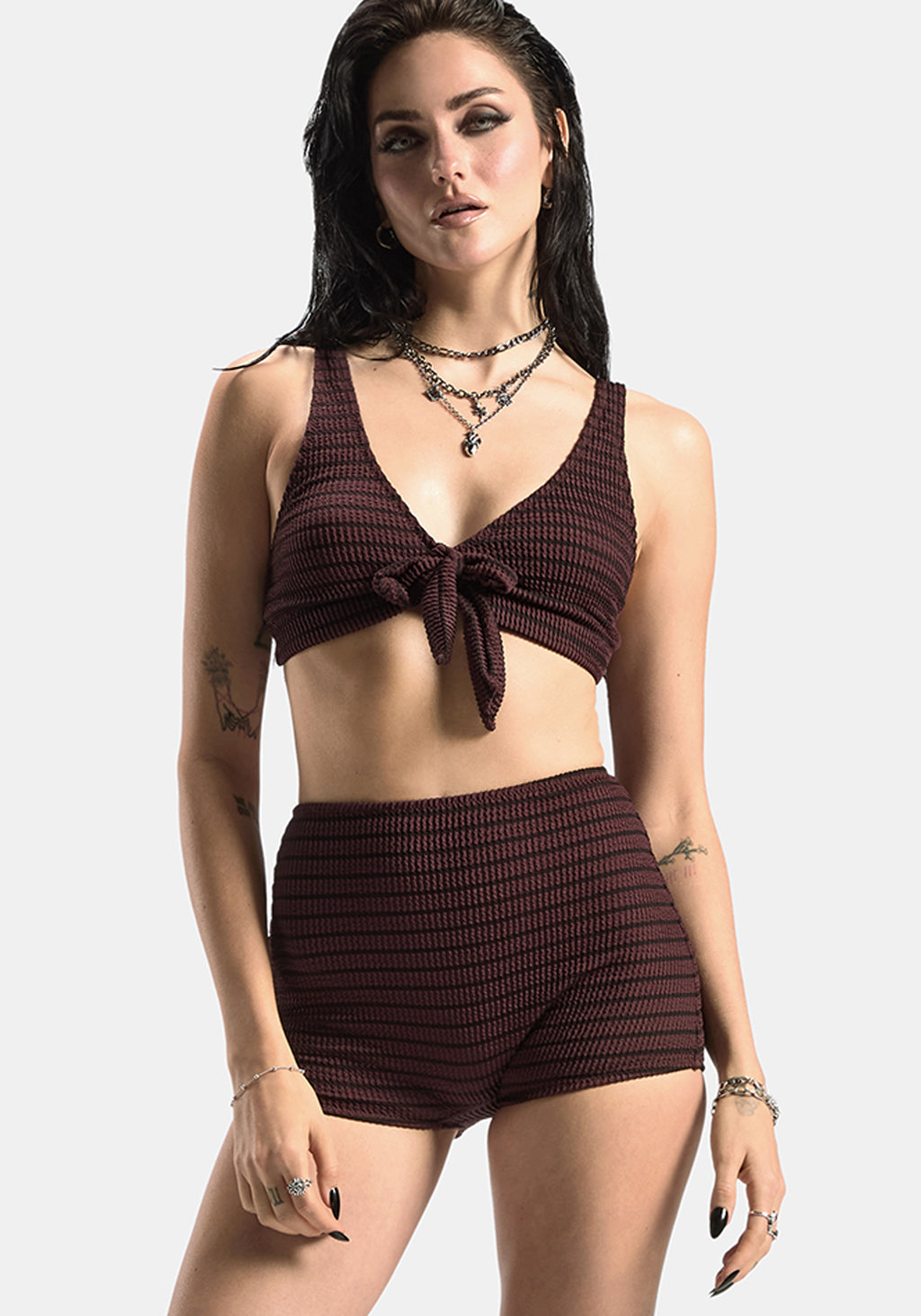 Mire Stripe High Waist Swim Shorts - Burgundy