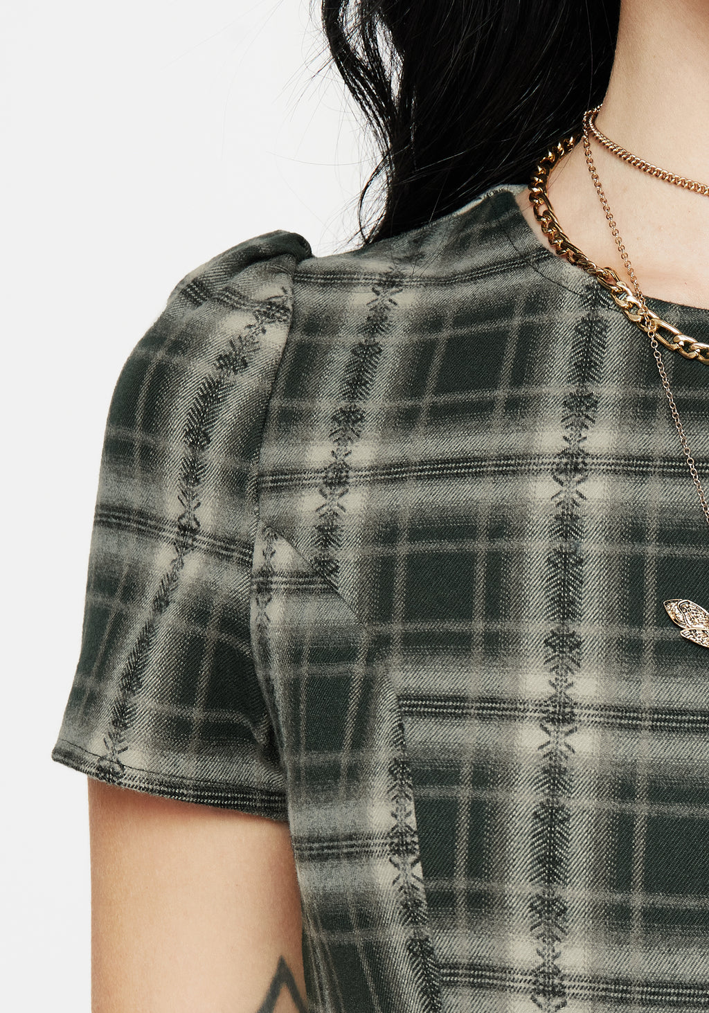 - Green check short sleeve midi dress