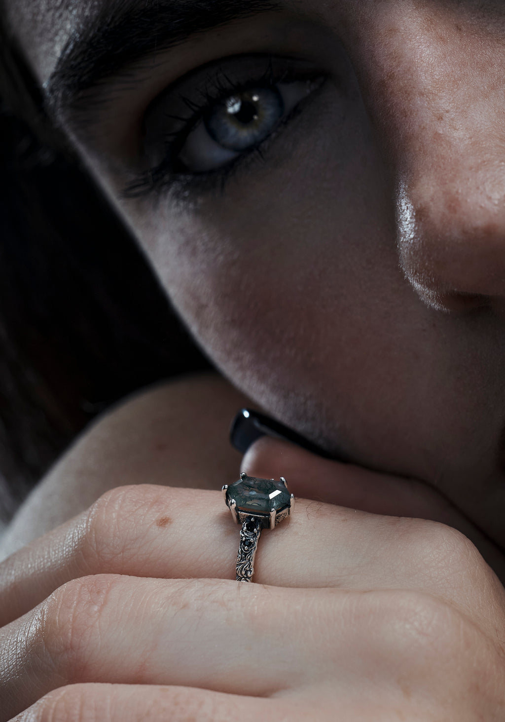 A fragment of the forest, bound in silver and whispered through moss. This delicate band features a green moss agate stone, accented with black spinel gems and spiral thorn engravings, evoking nature, mystery, and timeless devotion.