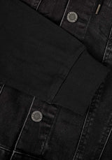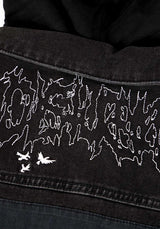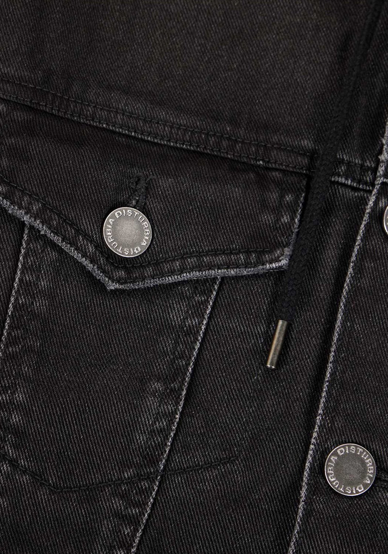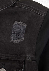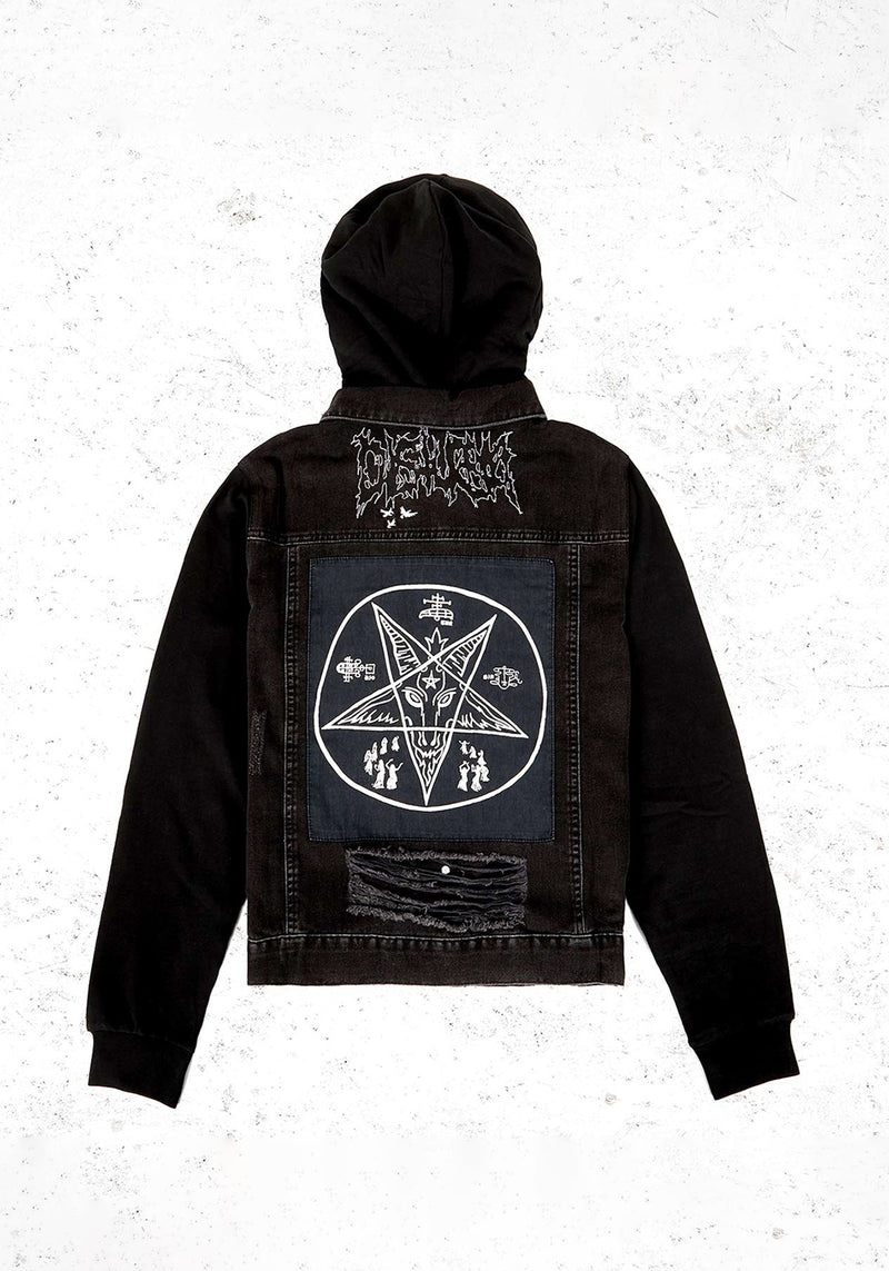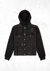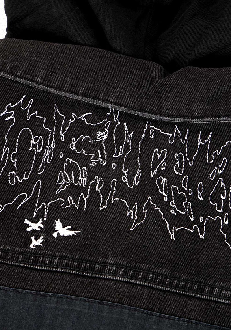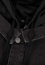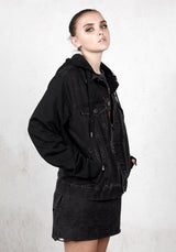 Washed, distressed denim jacket with cotton hood and sleeves.