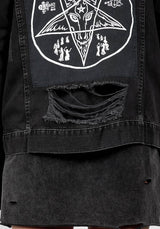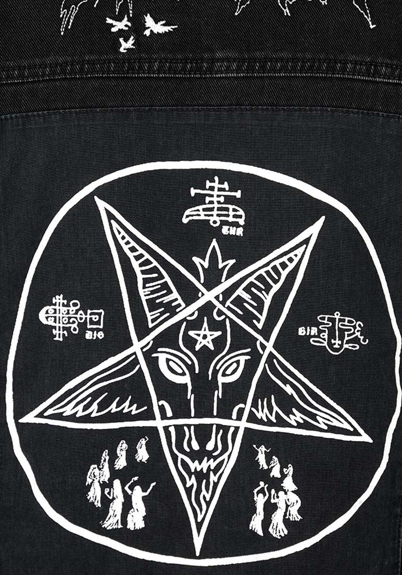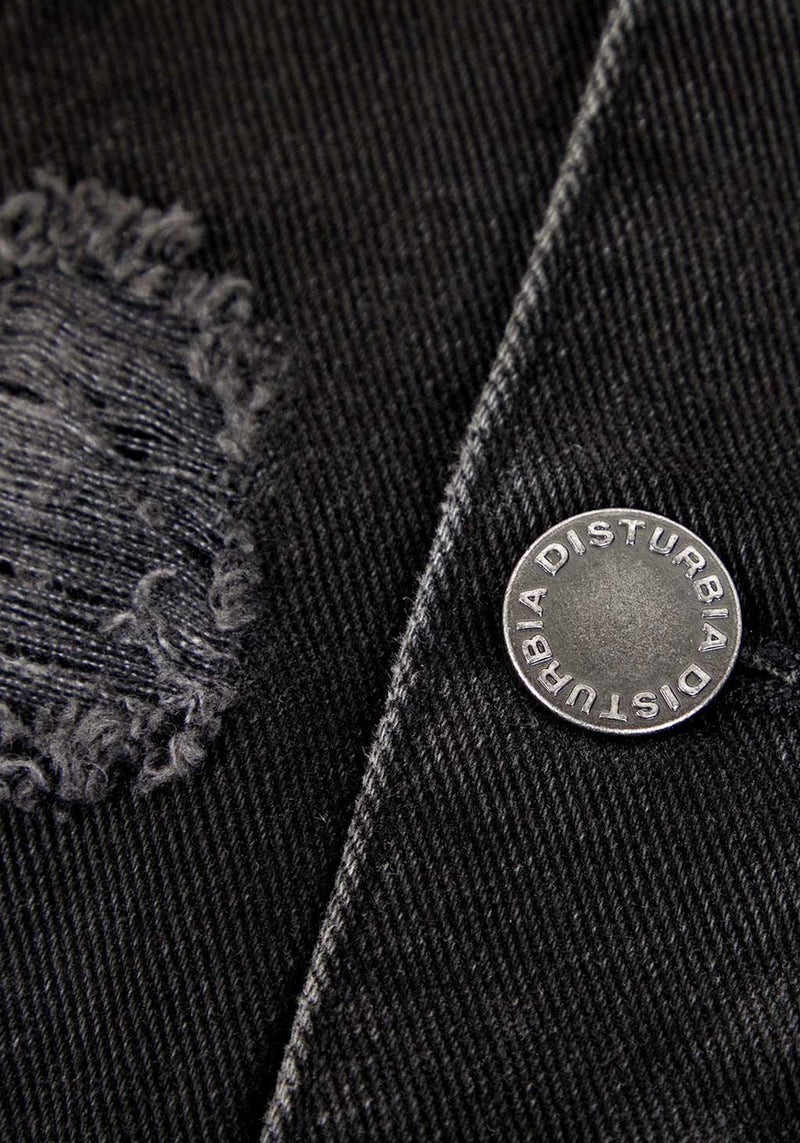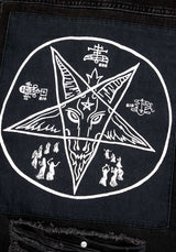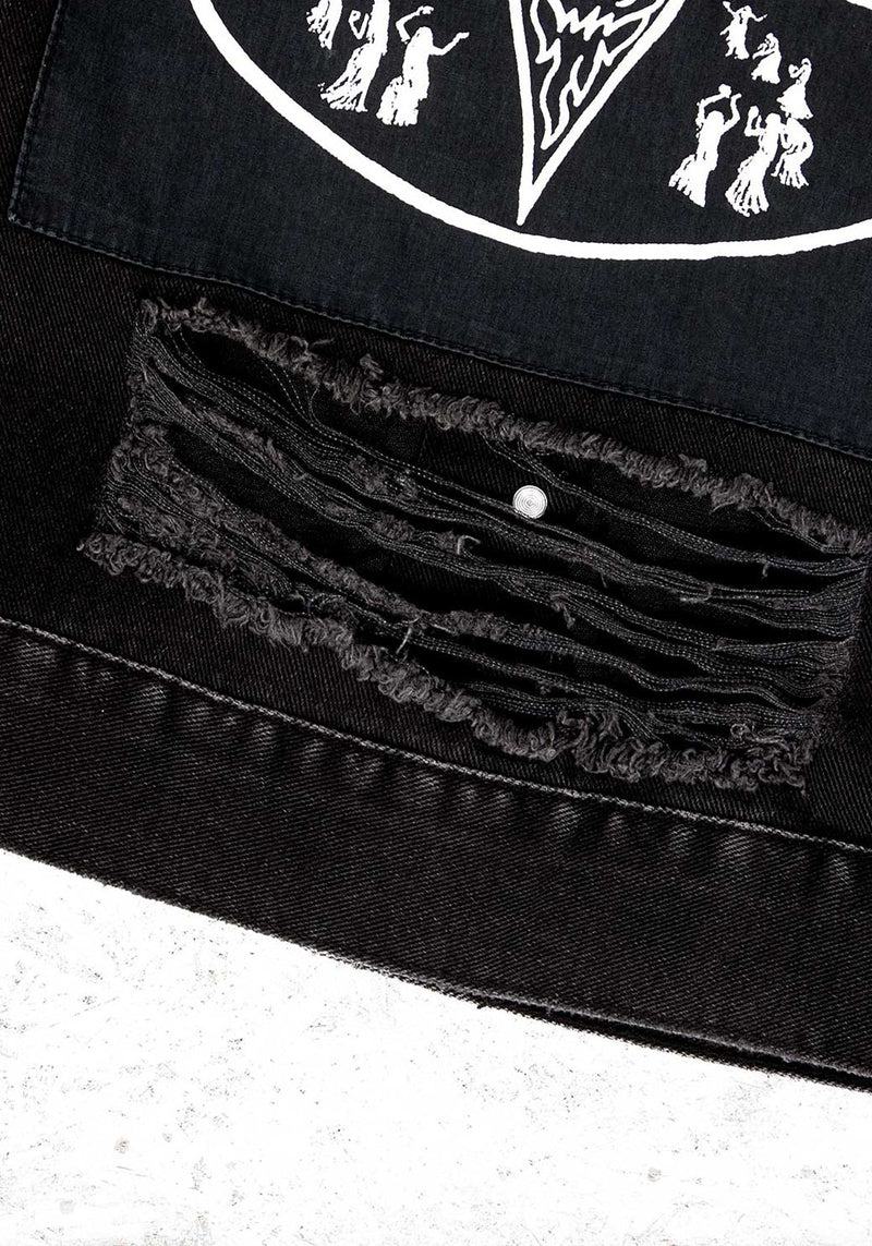Printed graphic back patch, yoke embroidery and blown out distressing.