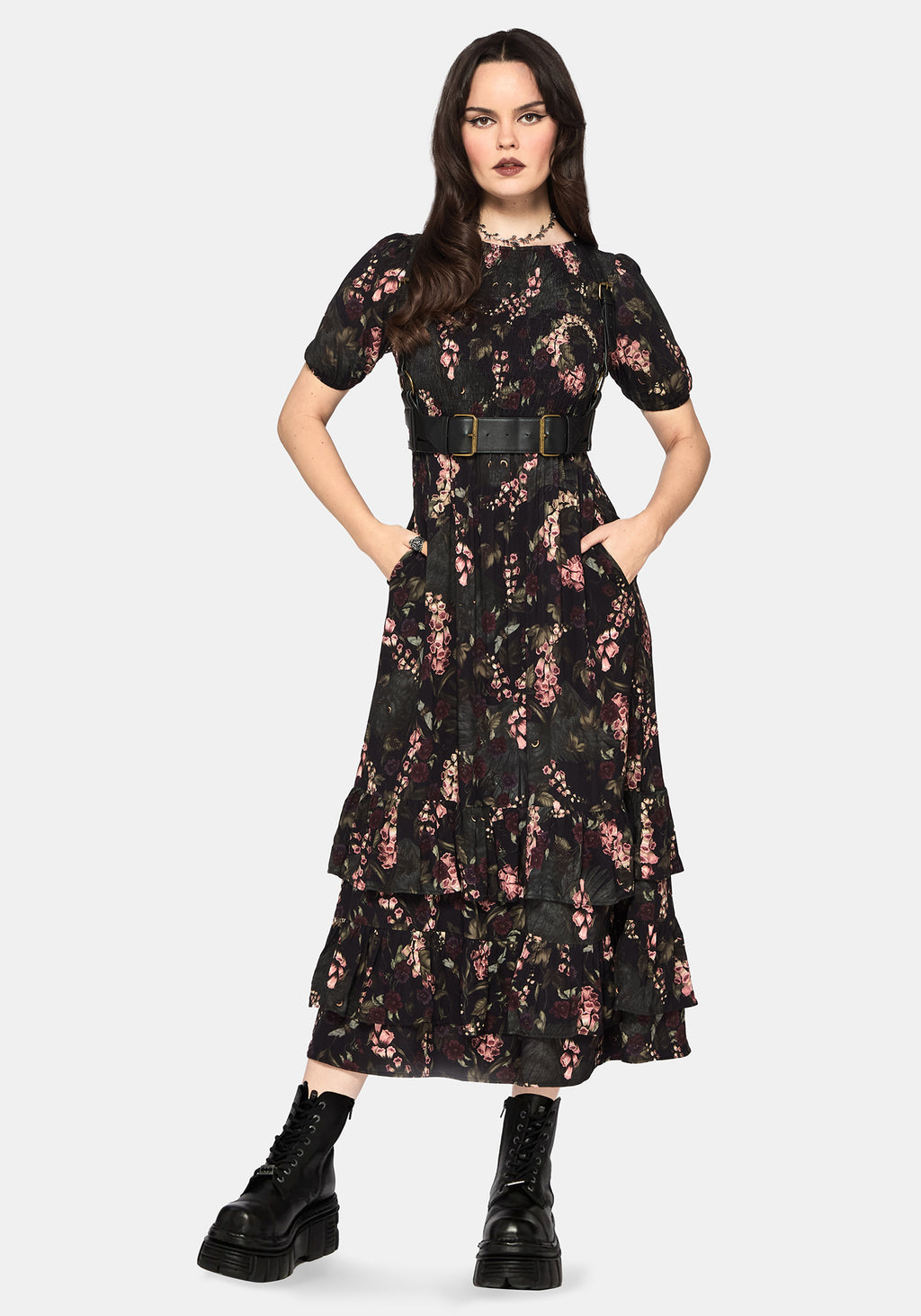 Noctua Owl Foxglove Printed Tiered Midaxi Dress