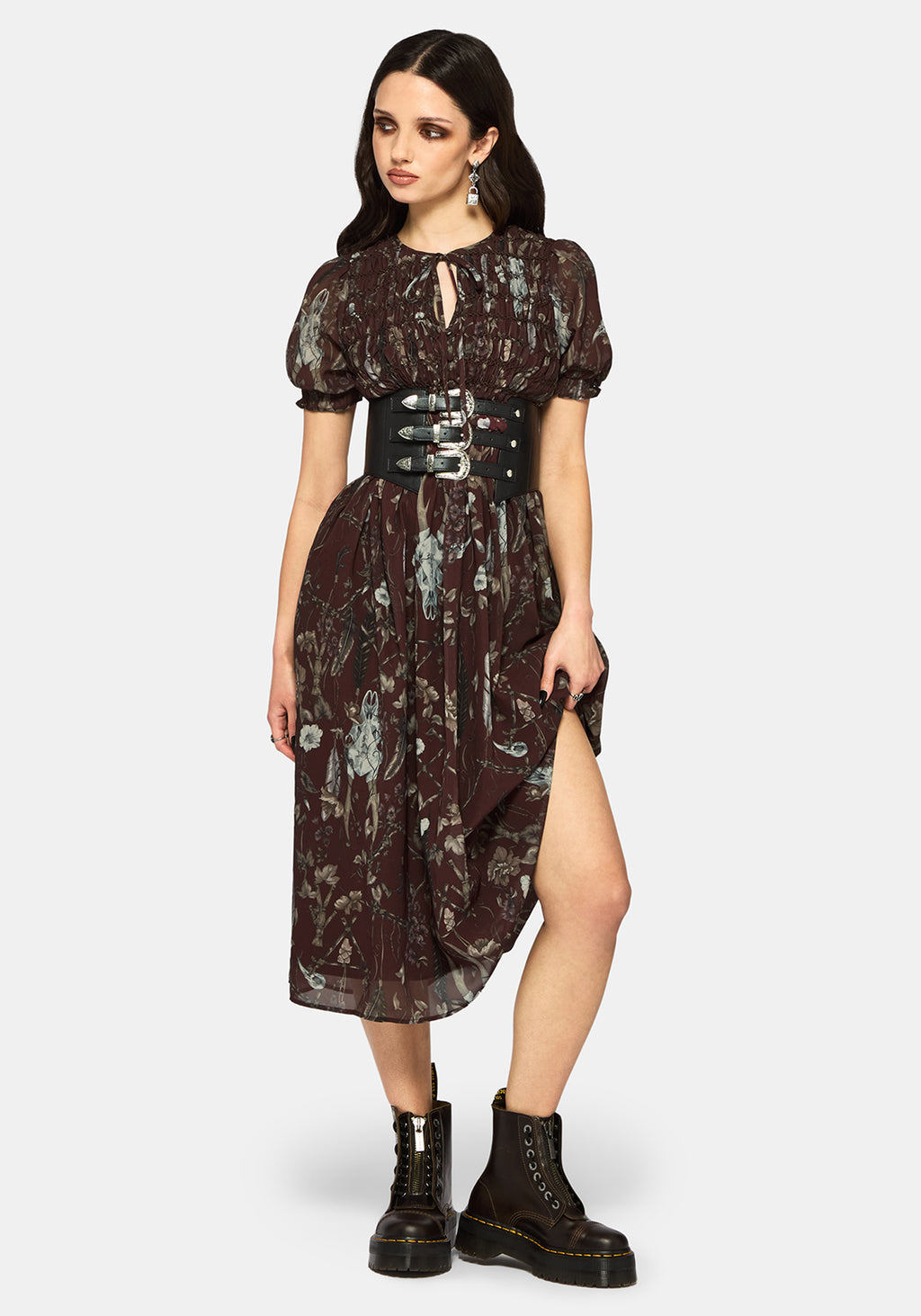Dusha Garden Print Chiffon Shirred Button Down Midi Dress