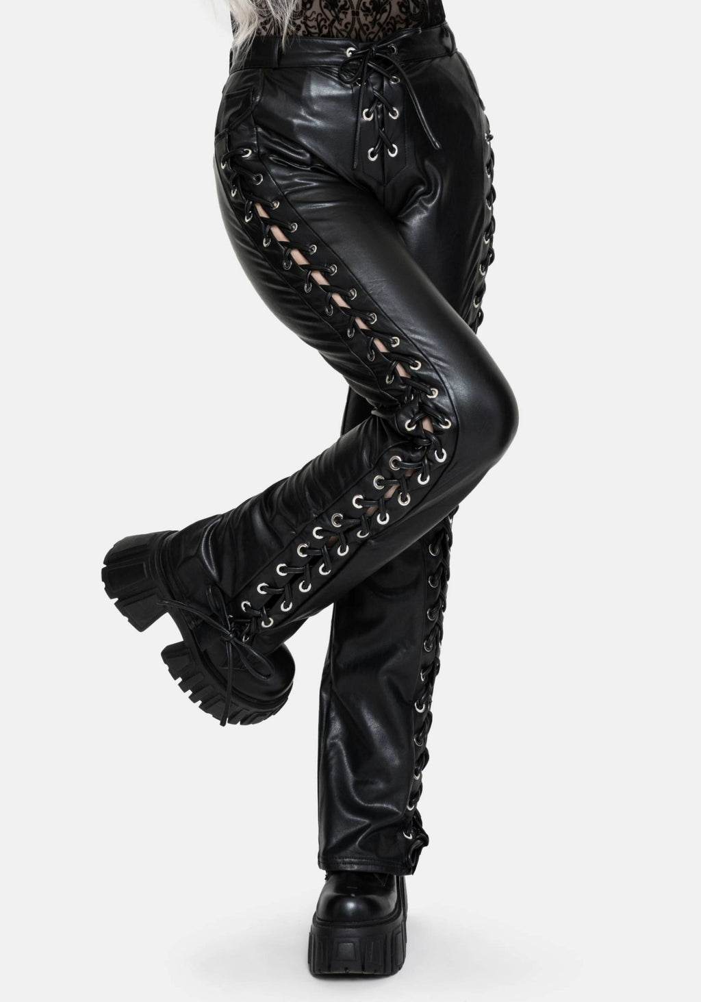 - PU leather cords thread through silver metal eyelets along leg side seams