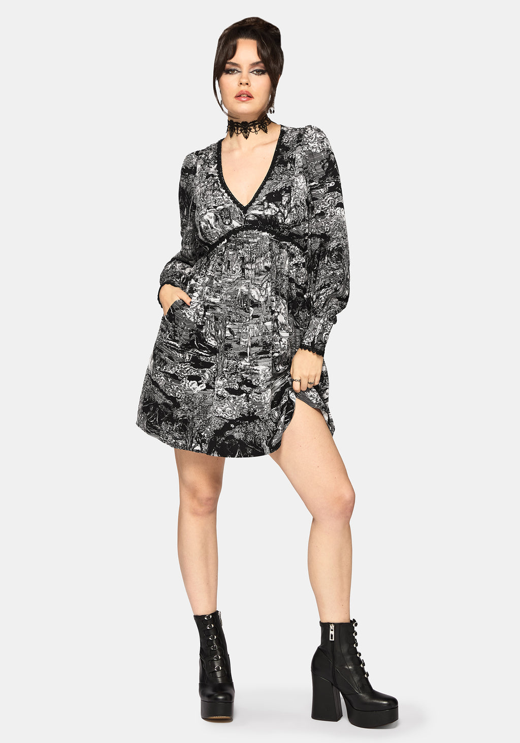 • Black and White Printed Mini Smock Dress