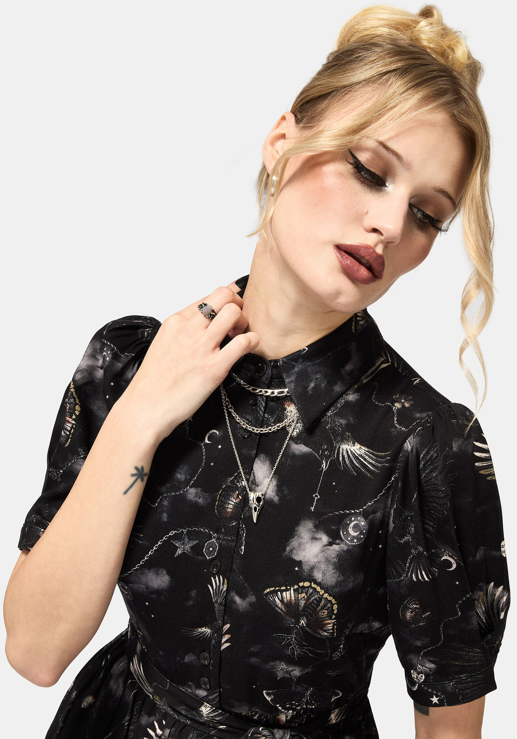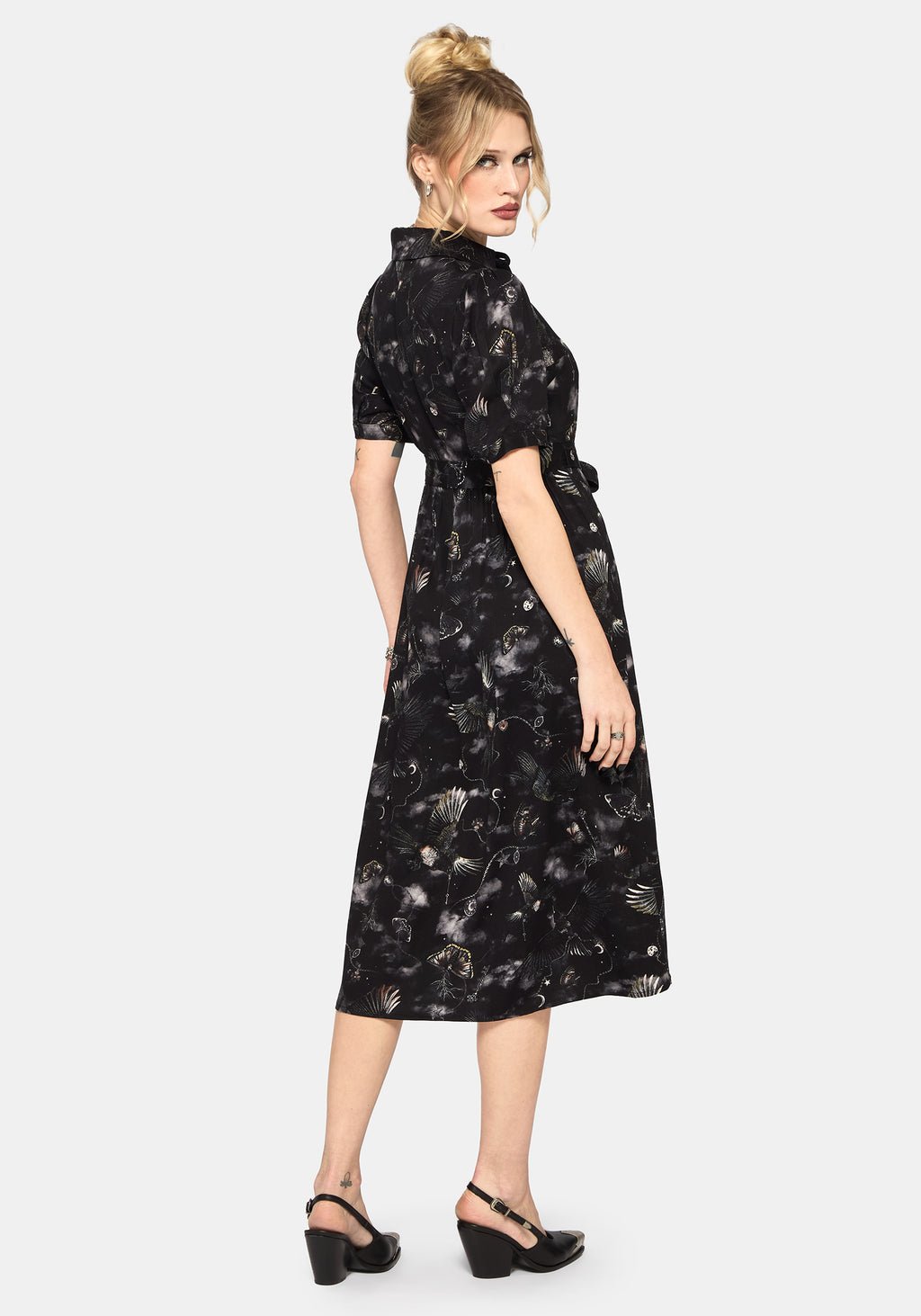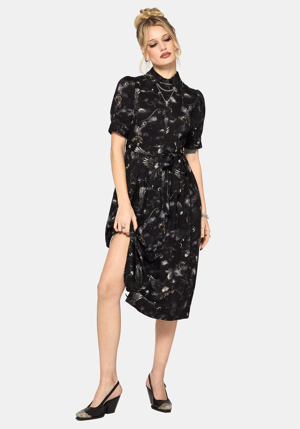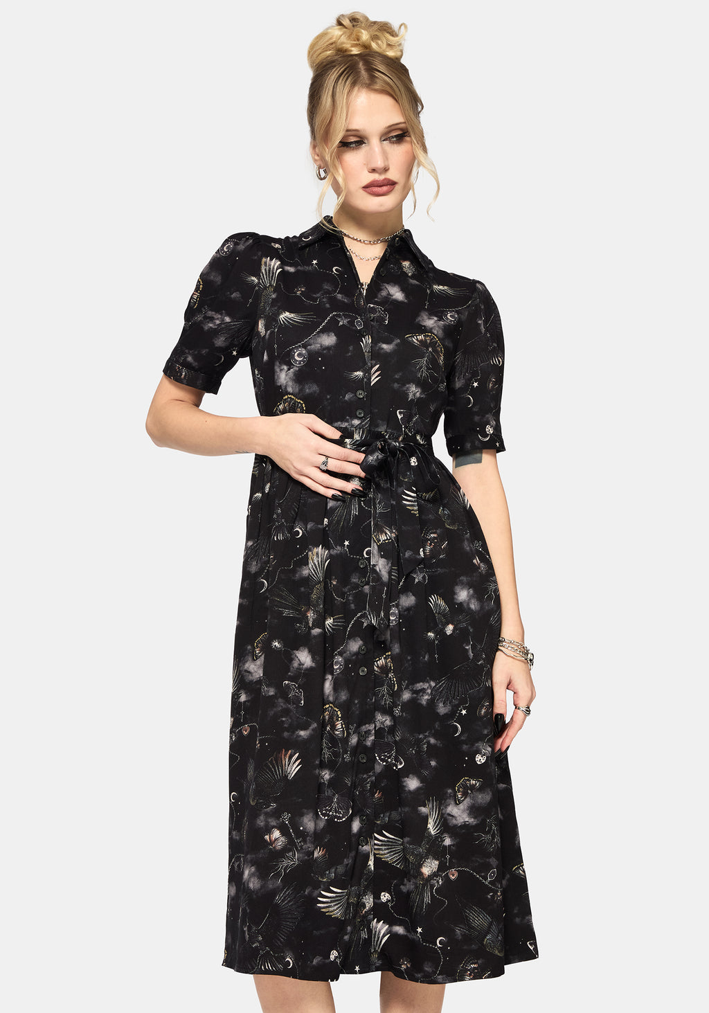 Crimson Magpie and Moth Print Midi Shirt Dress