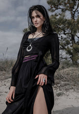 - Rich purple Celtic-inspired floral embroidery on front belt