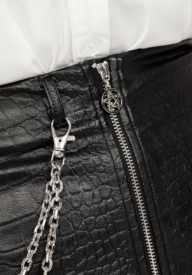 - Silver chain with pentagram charm affixed to waistband via lobster clasps