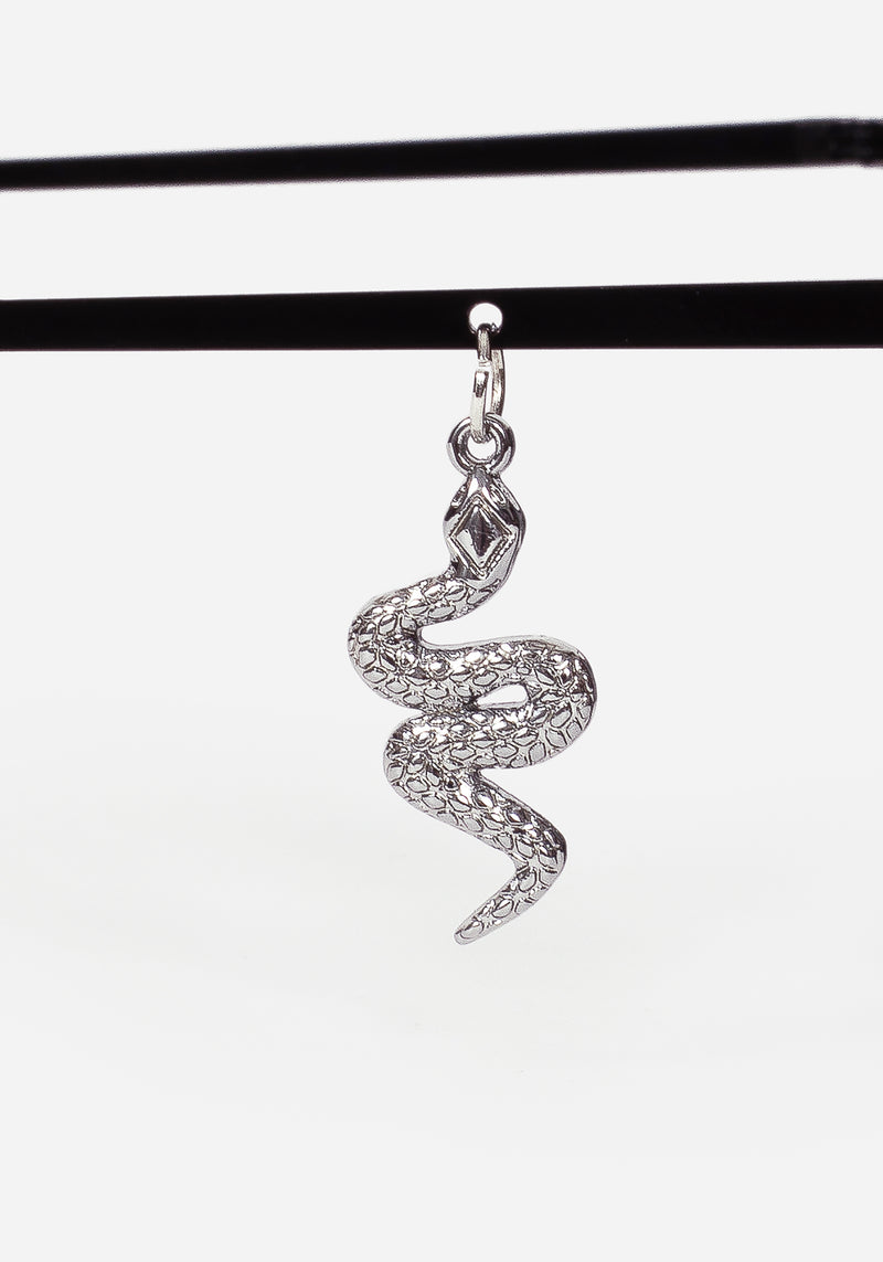 - Silver snake charm hangs from O-ring fastened through drilled hole in temple