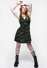 - Black & green leaf print V-necked mini dress
