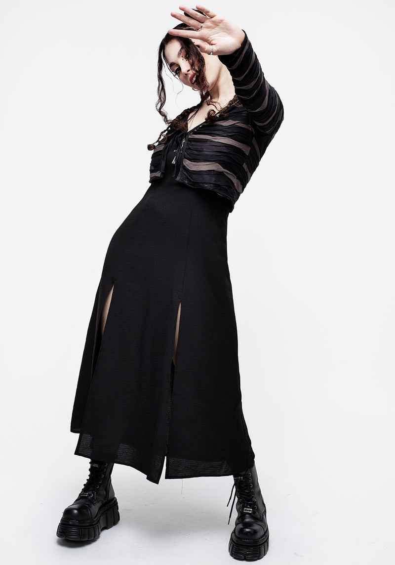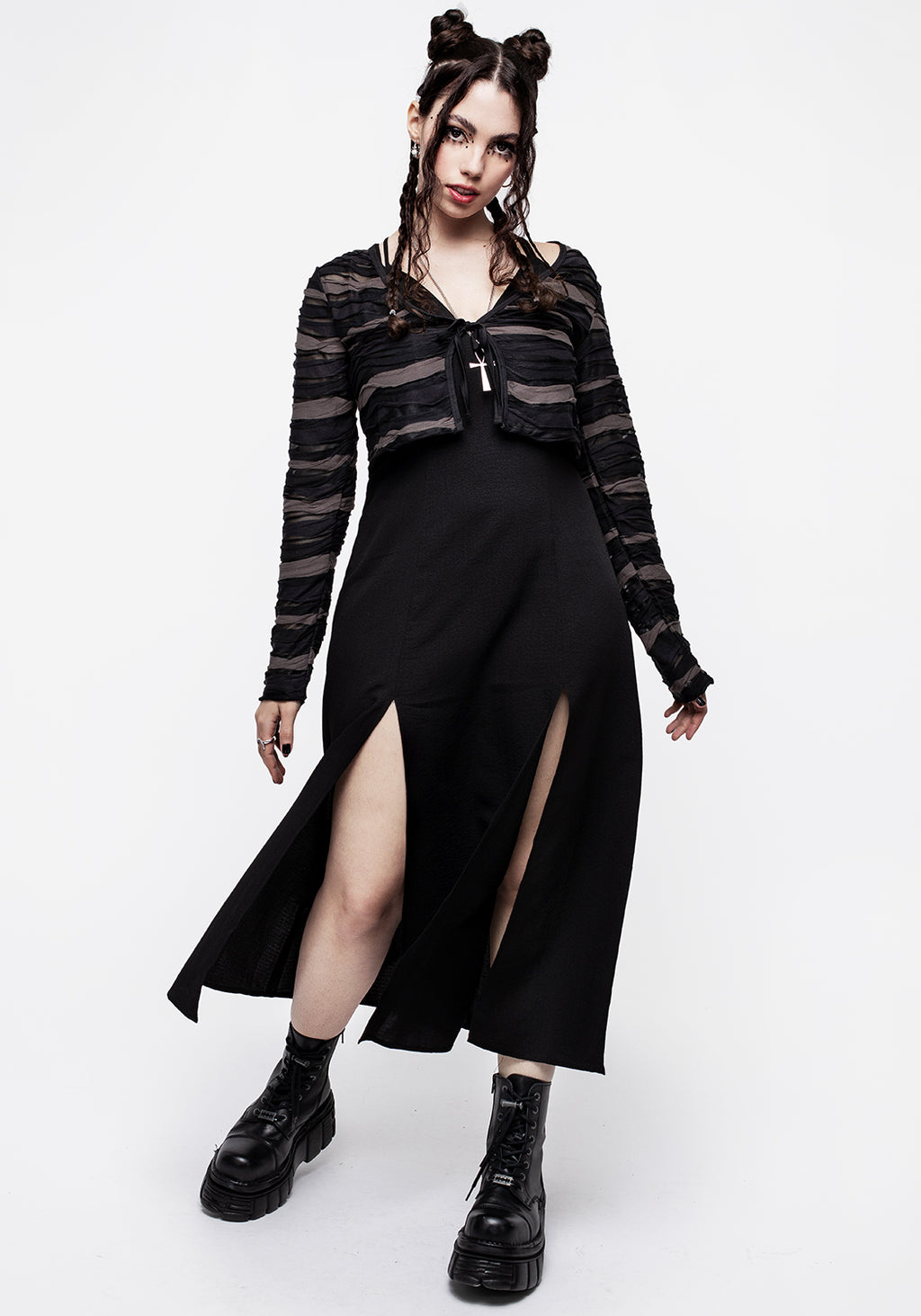 - Dimensional black and mushroom grey jersey strips overlay sheer mesh
