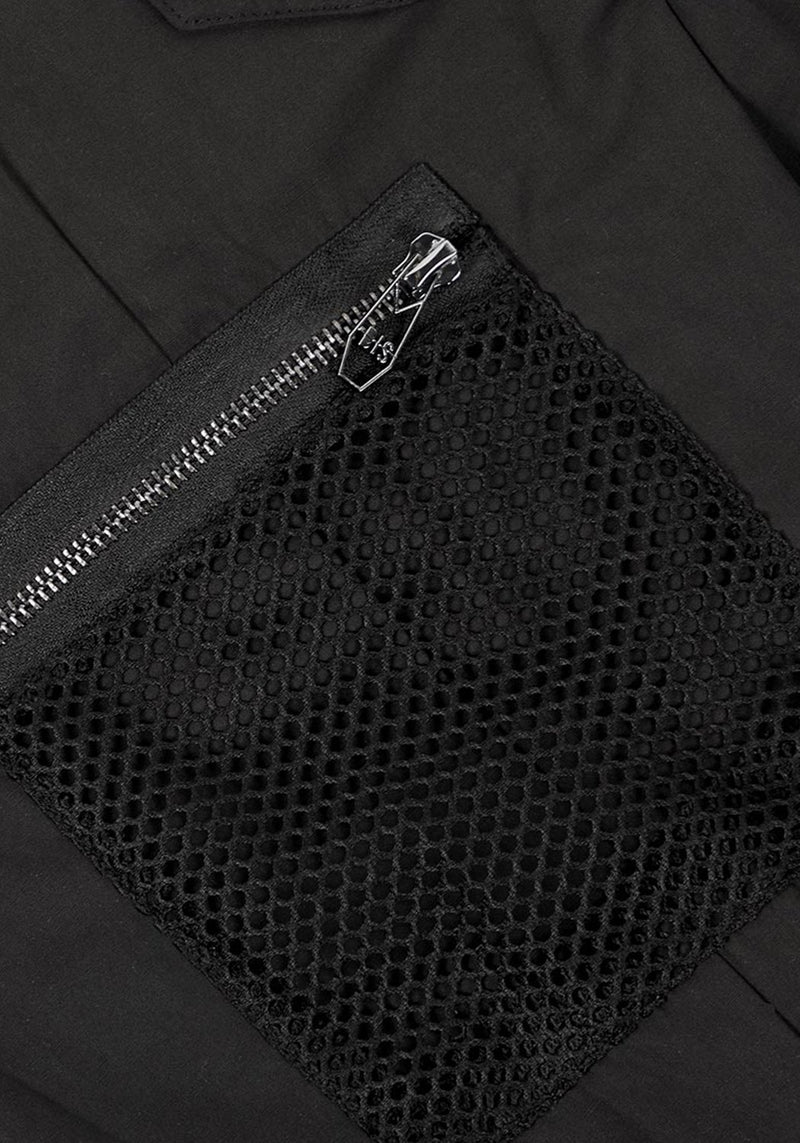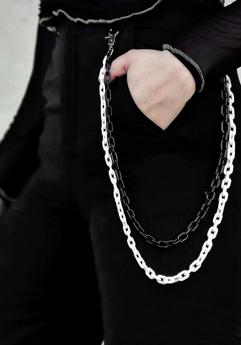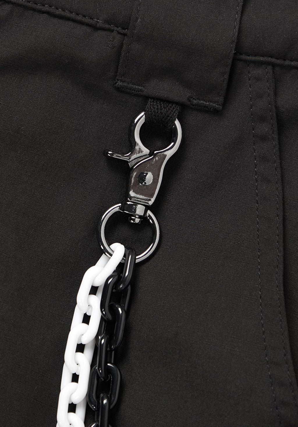 Double black and white plastic belt chain, mesh pocket and branded zip pull details.