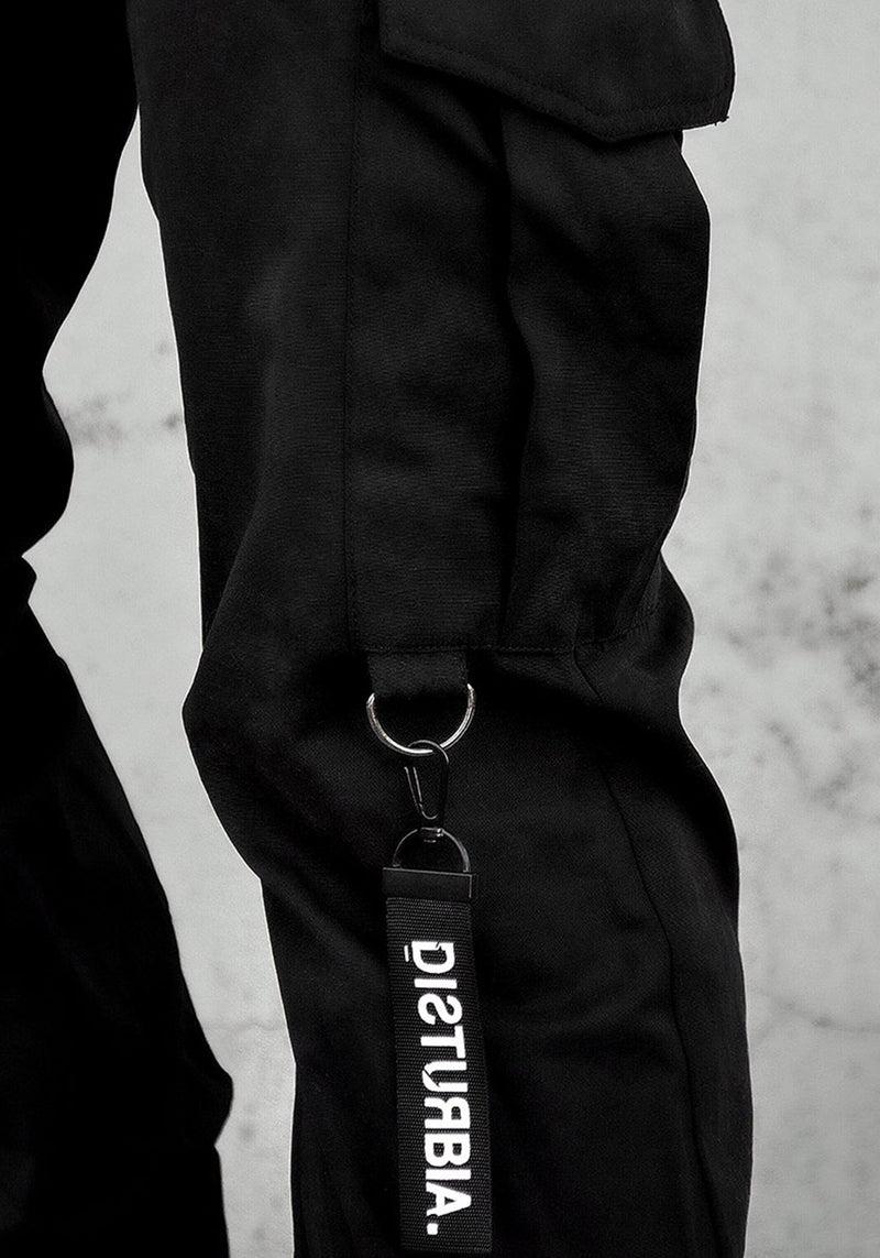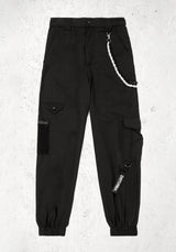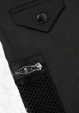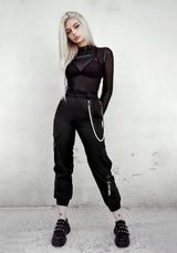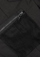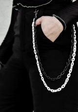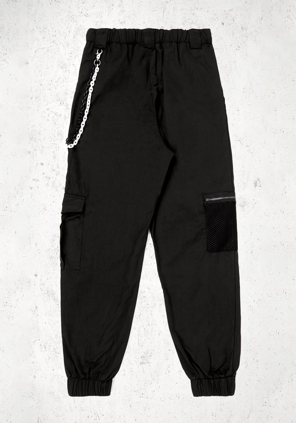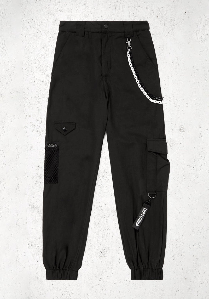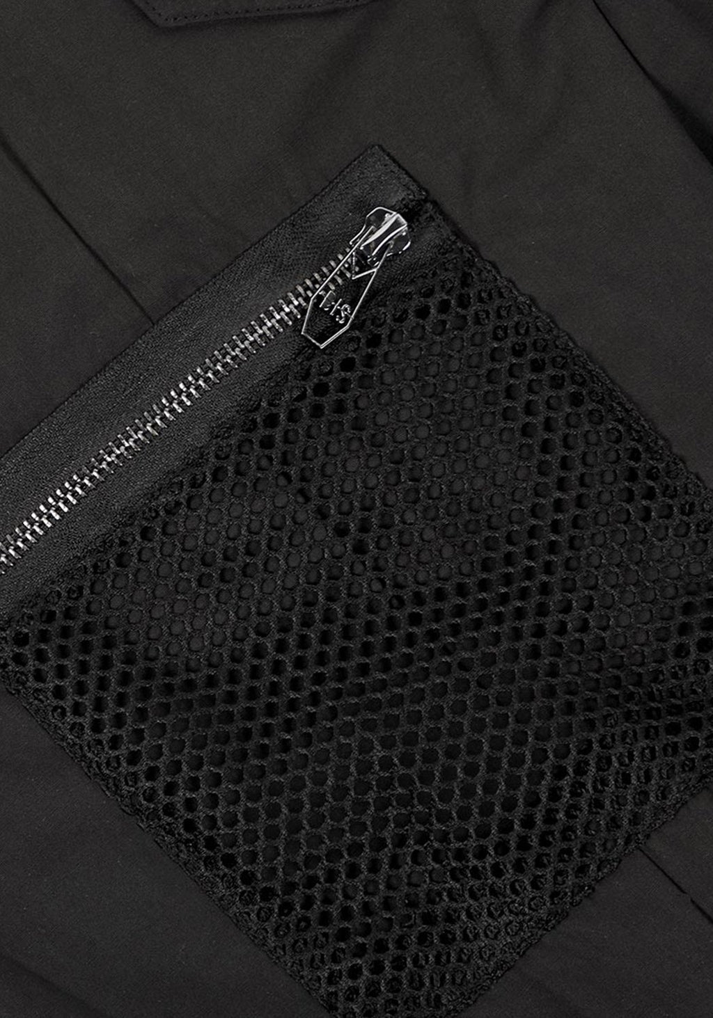 Double black and white plastic belt chain, mesh pocket and branded zip pull details.