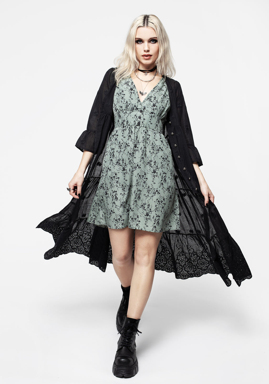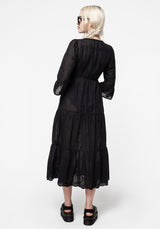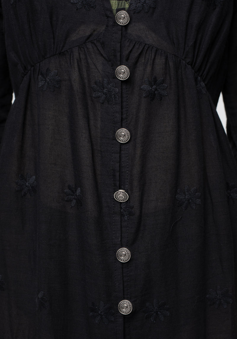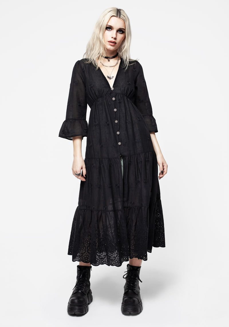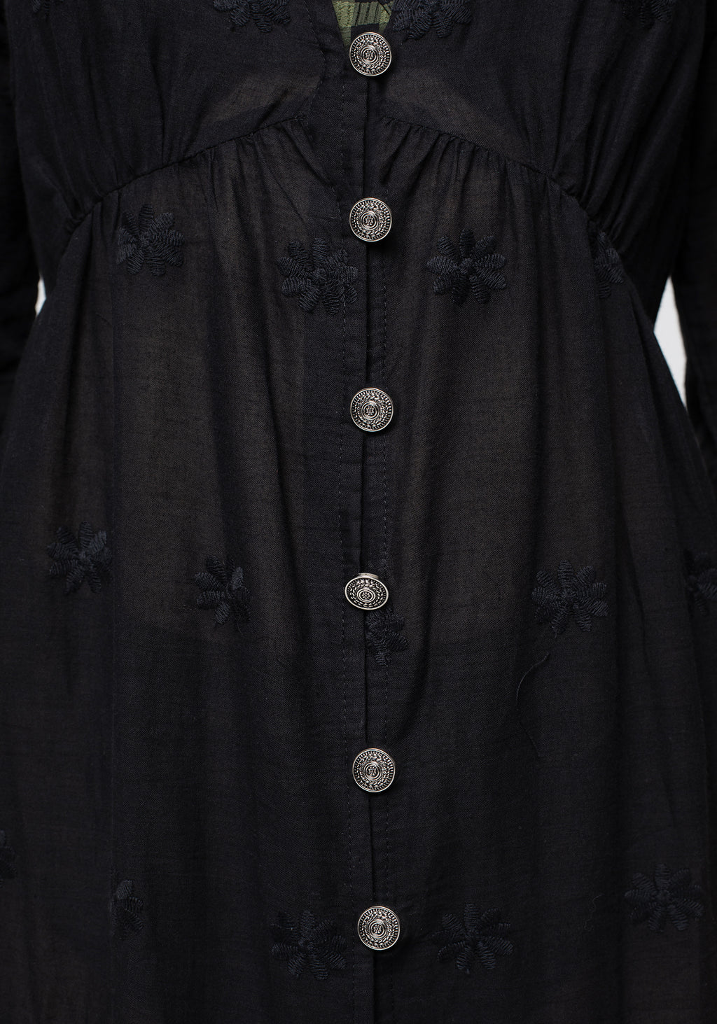 - Button-front fastening on upper half of dress leaves tiered midi-length skirt open & breezy