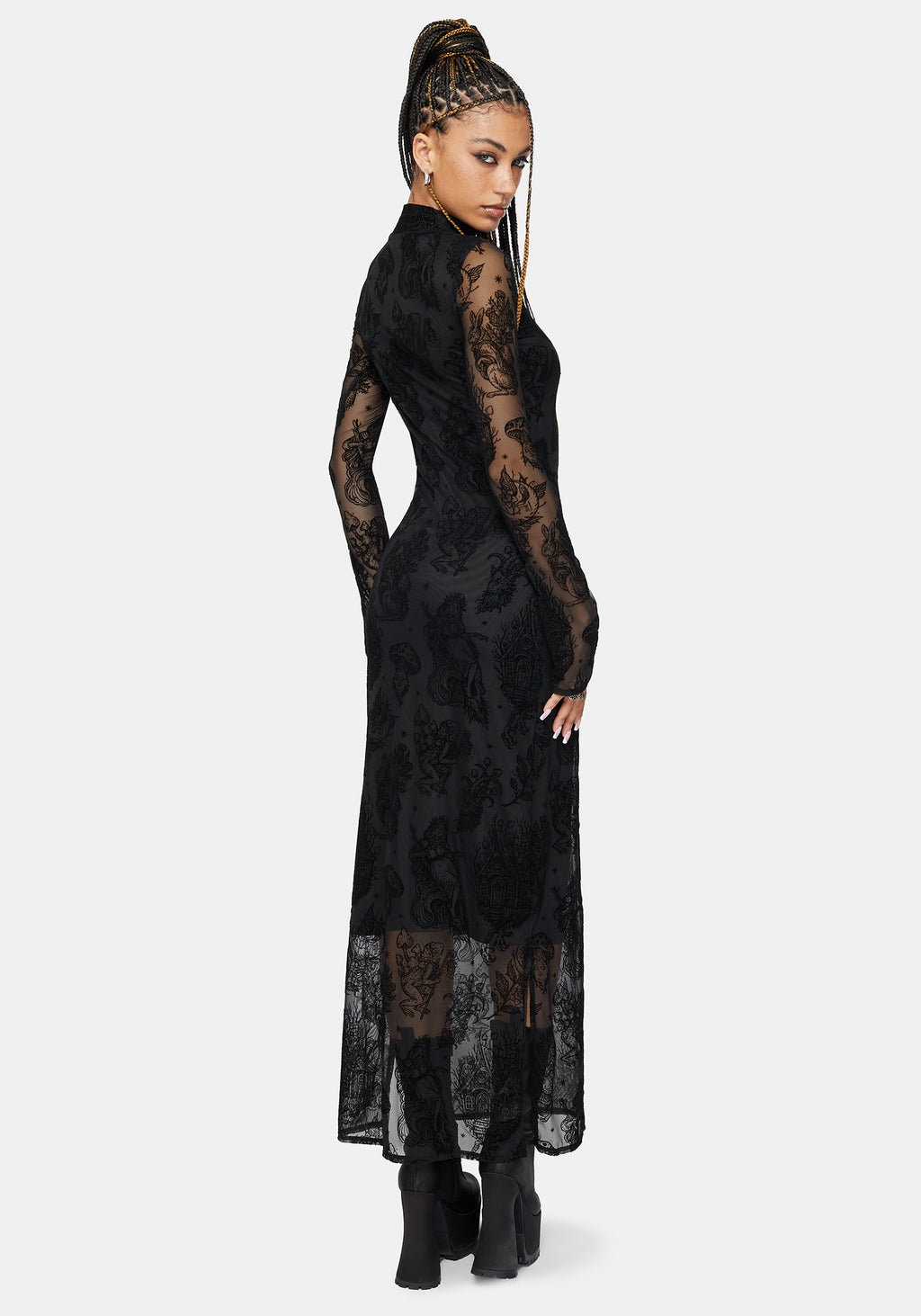 Hexborn Baba Yaga High Neck Flocked Long Sleeve Mesh Maxi Dress