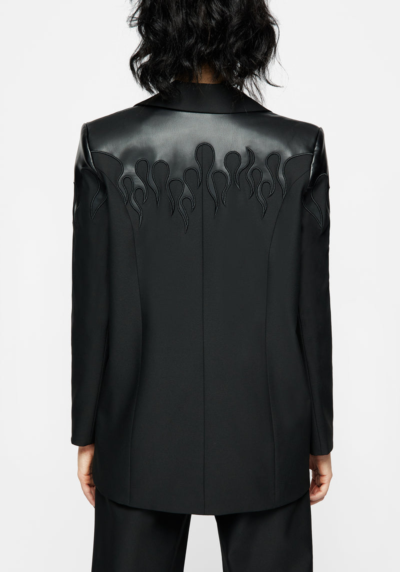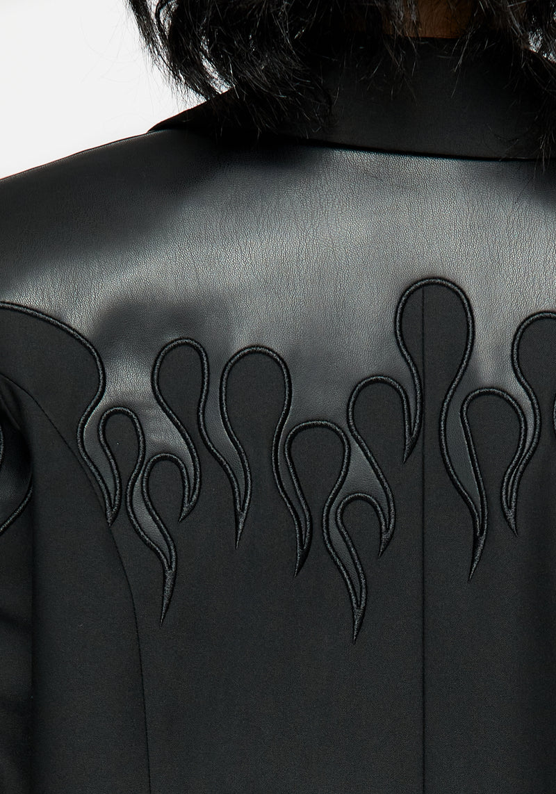 - Black blazer with faux leather flame design