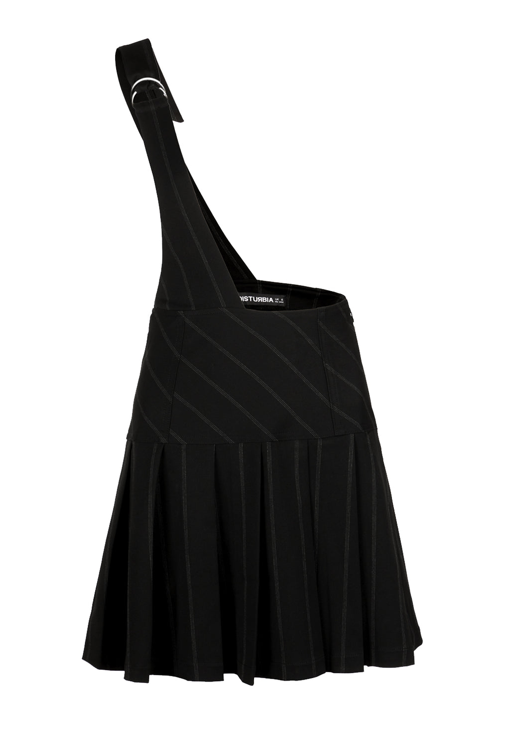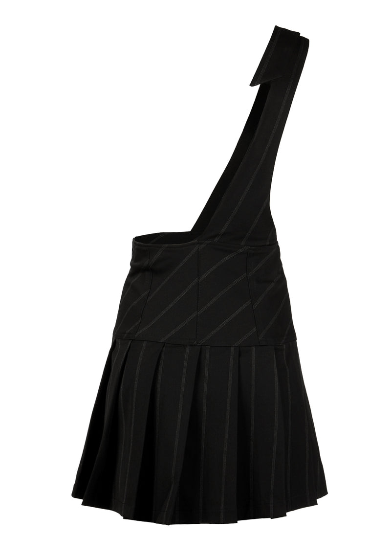 ■ Pleated black pinstripe skirt with shoulder strap