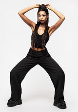 - Wide waistband with lace-up chain detail at hips