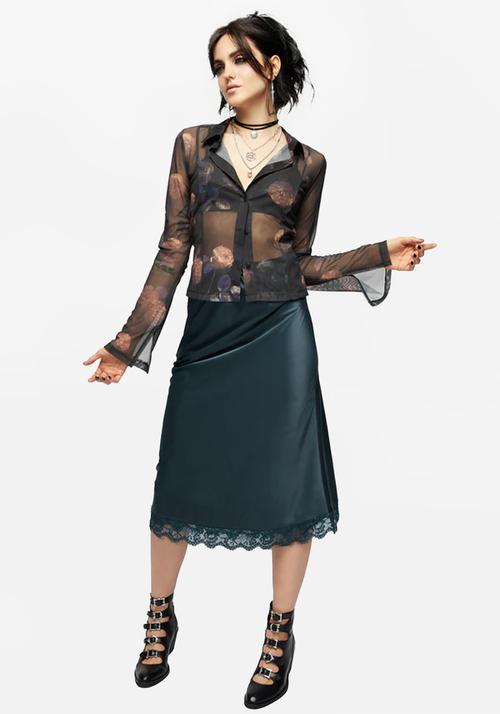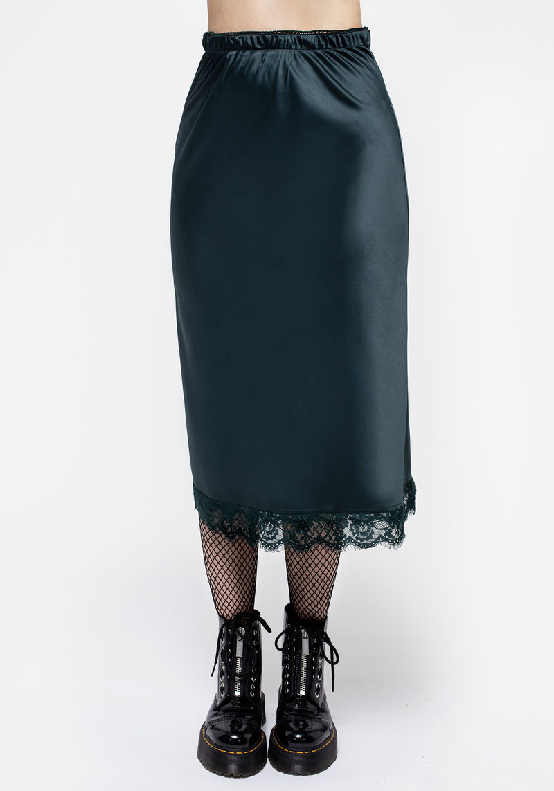- Green lace-trimmed satin midi skirt