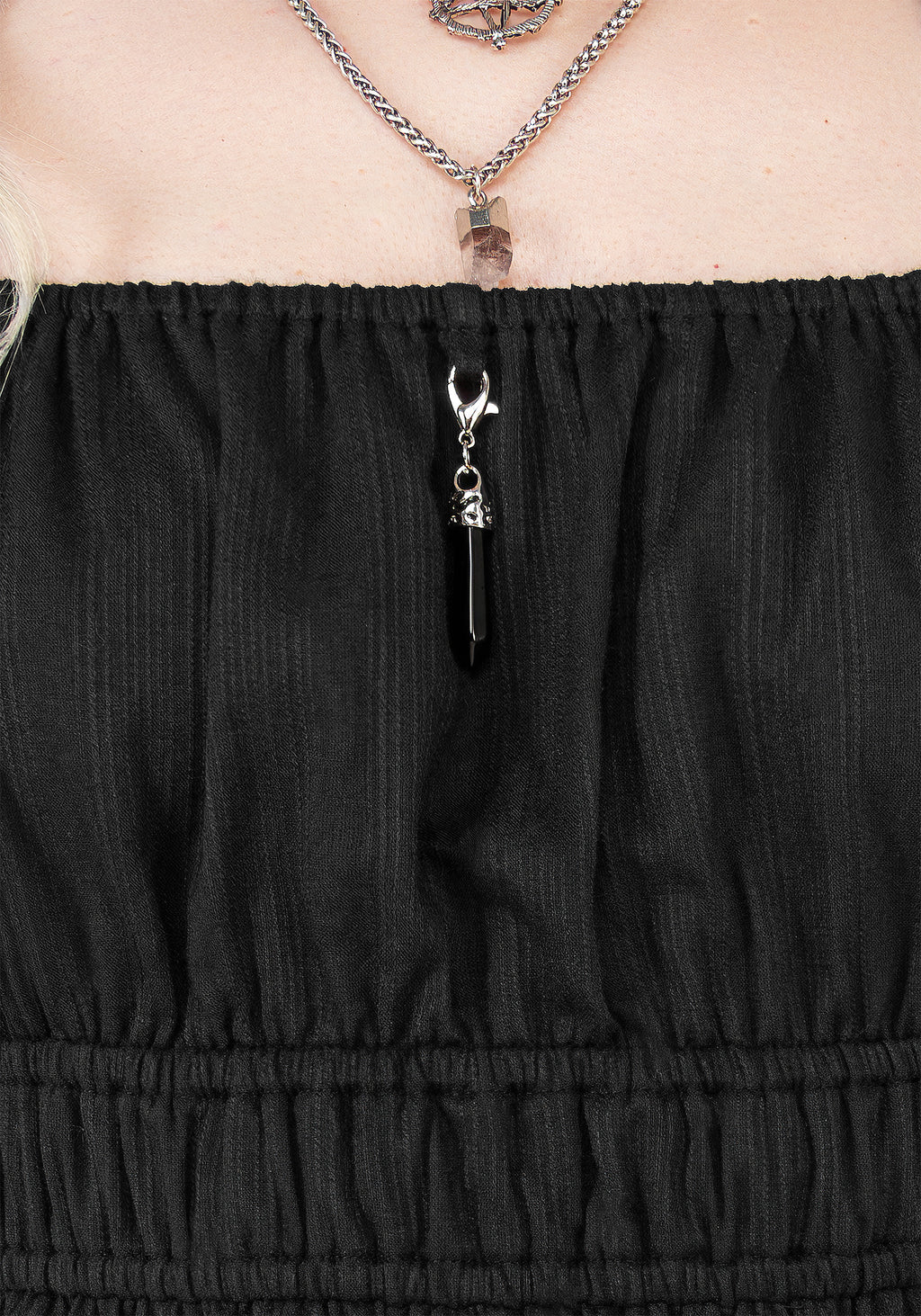 - Black gemstone charm hangs from neckline (removable via lobster clasp for easy washing)
