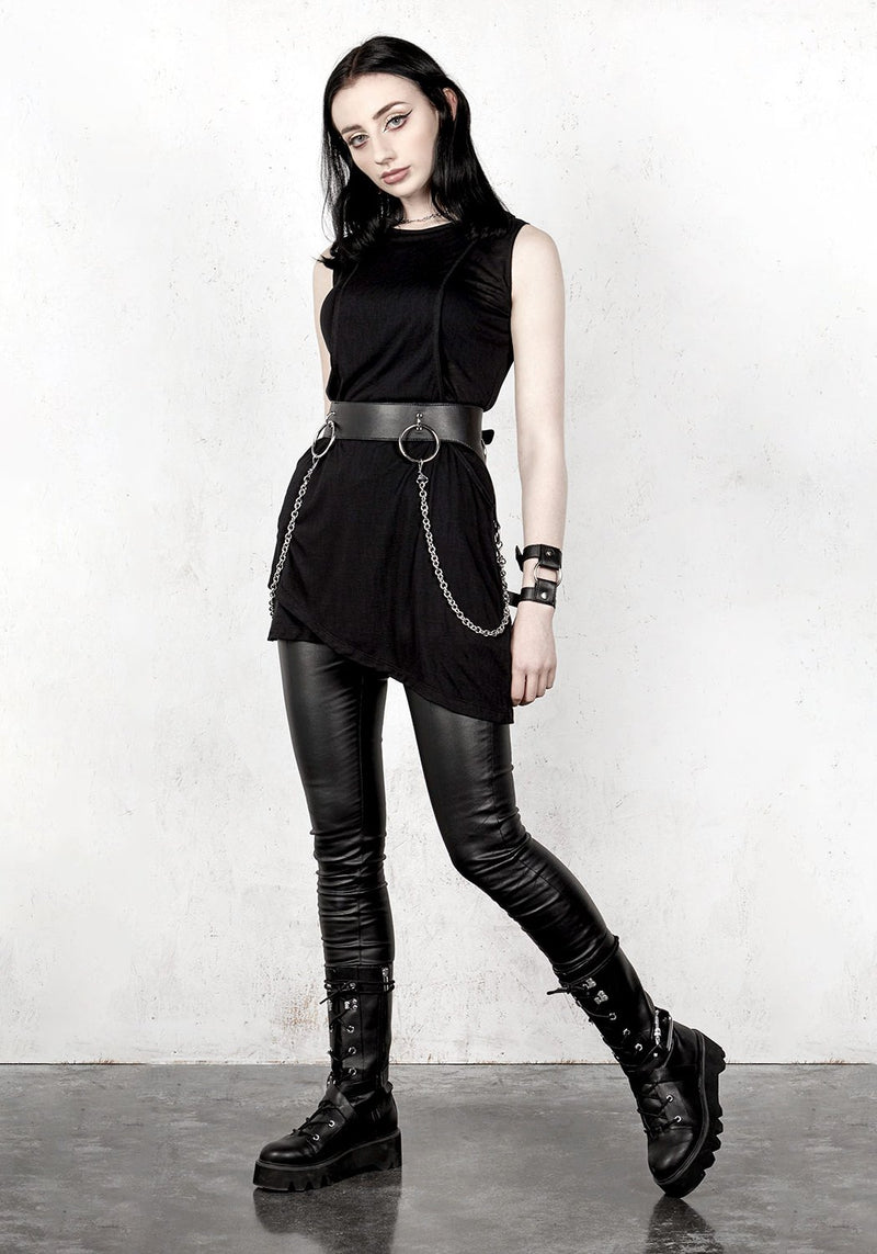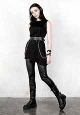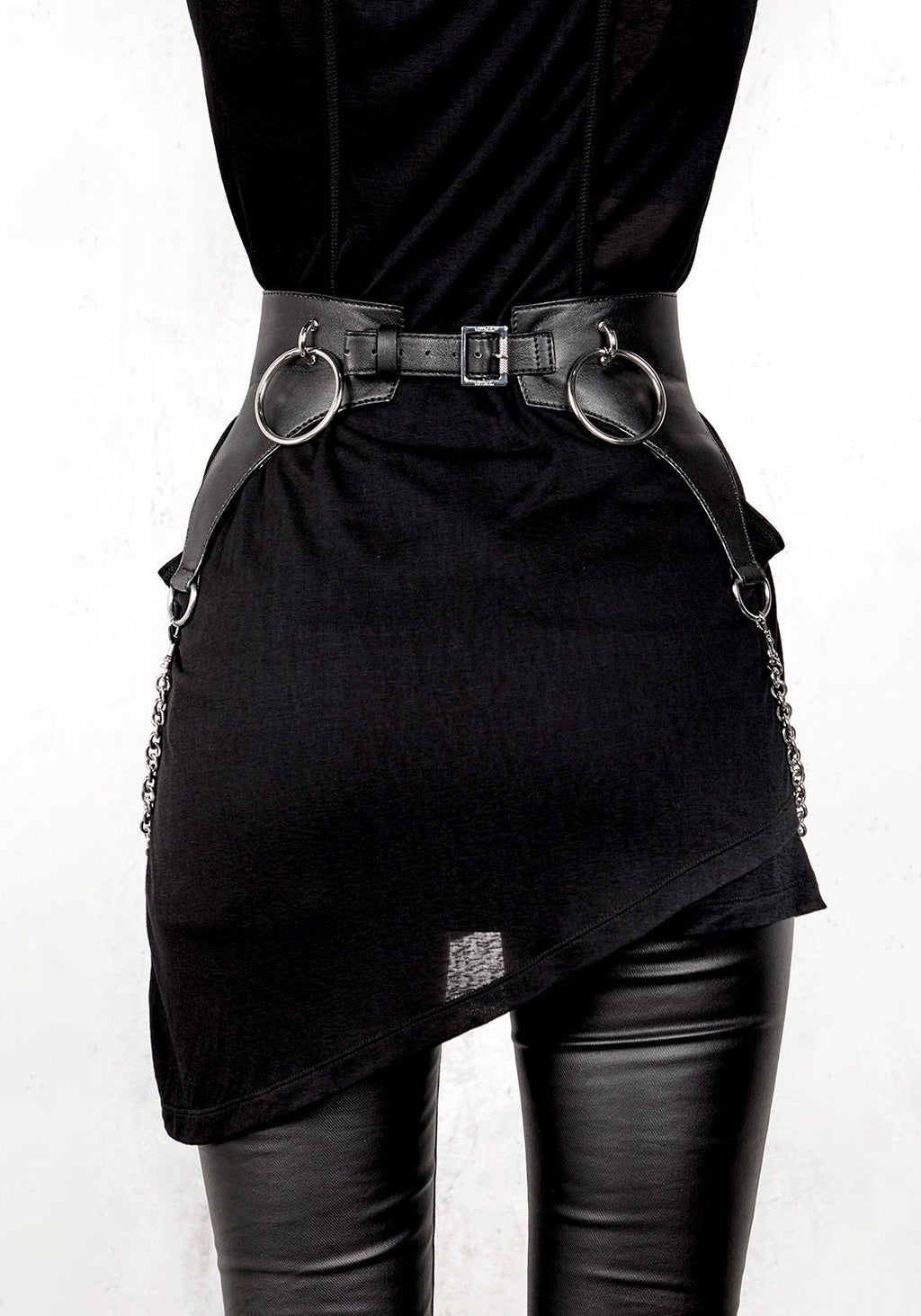 Silver metal clips to attach/remove high-shine silver chains at front of belt