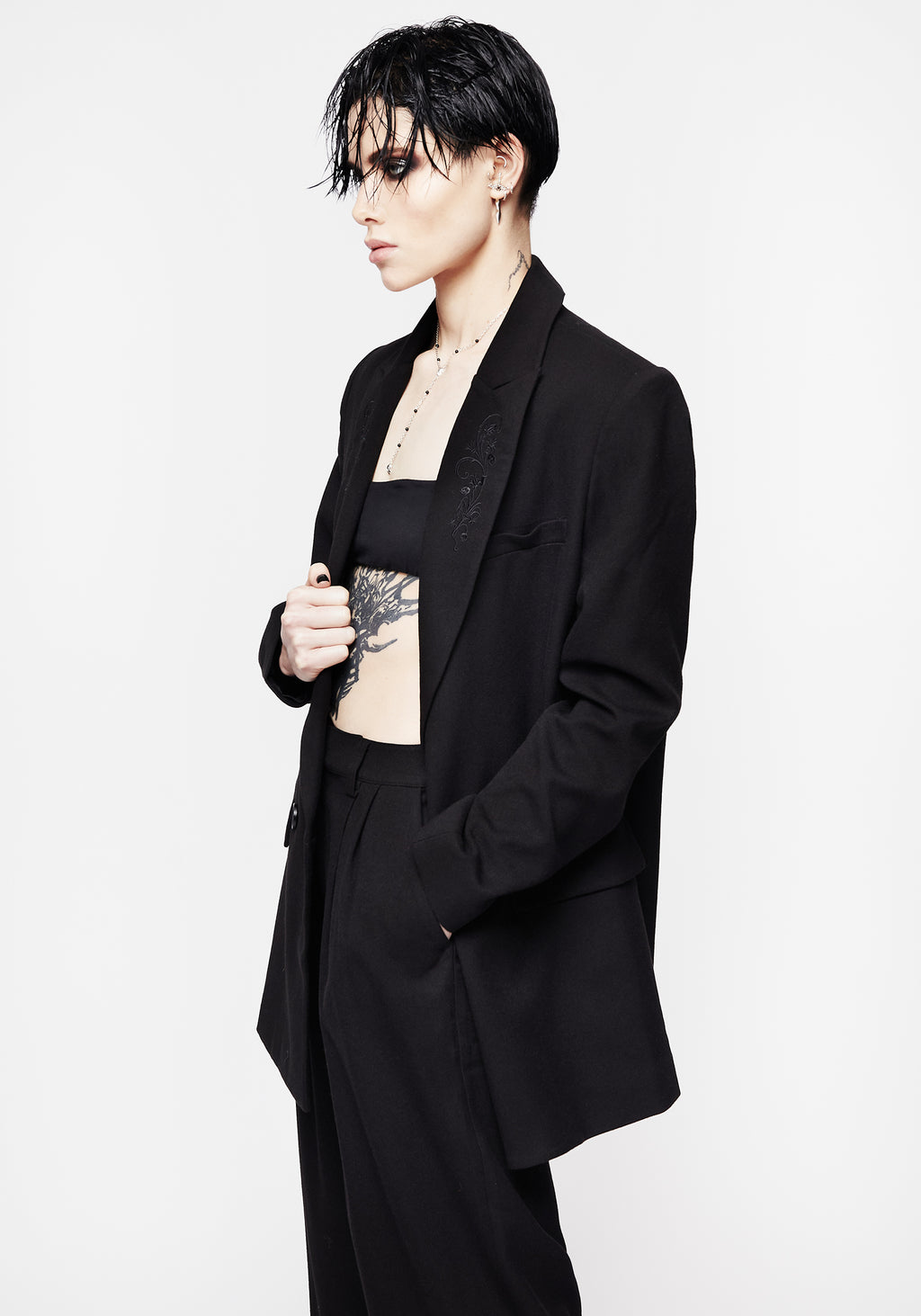 - Embroidered notched lapel slopes into V-neckline