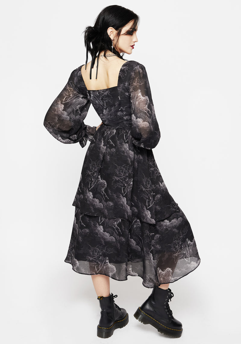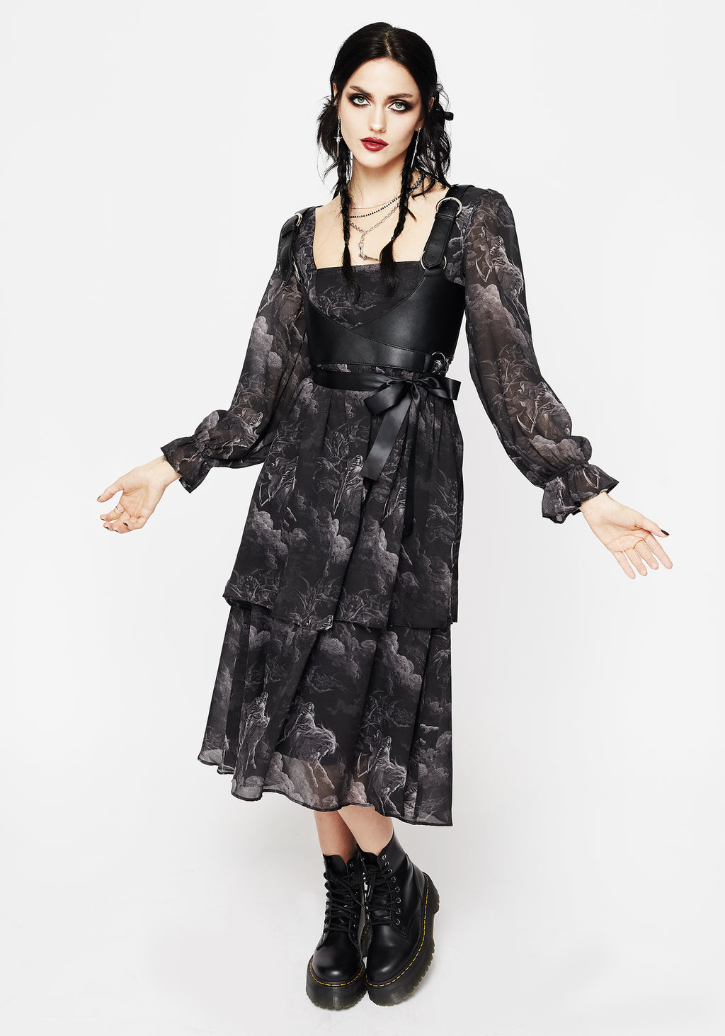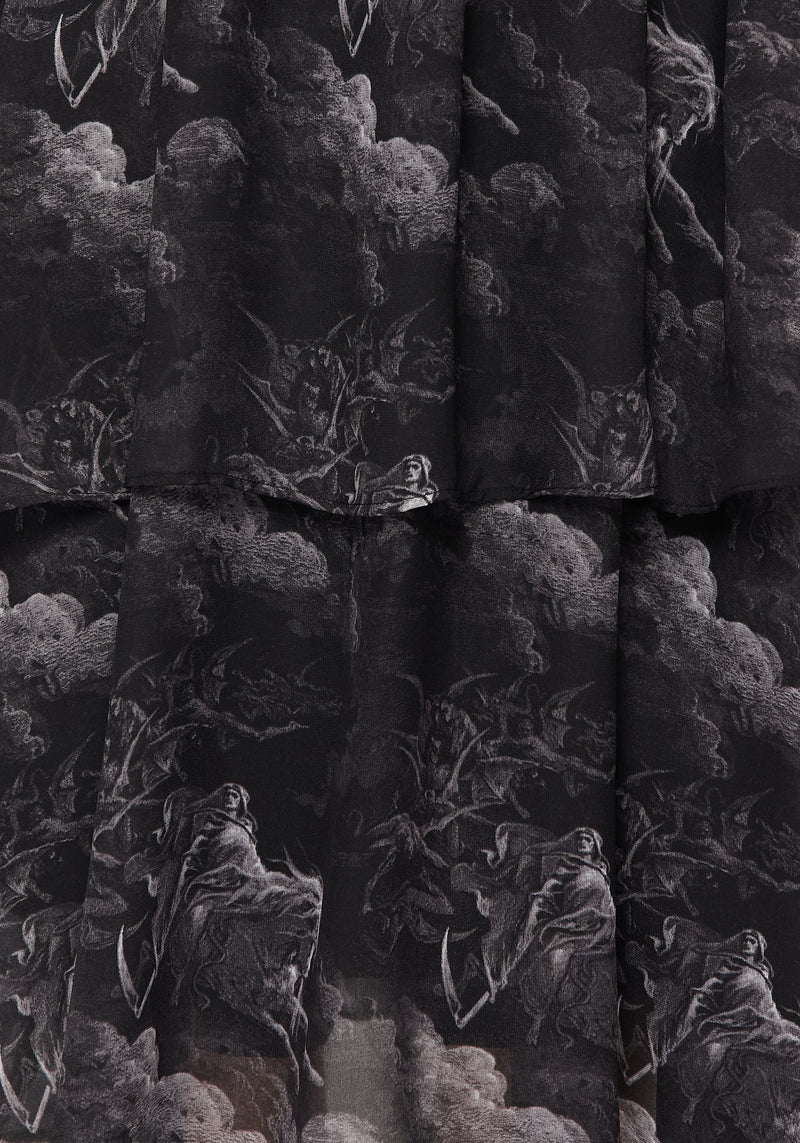 - Black chiffon layered midi dress with apocalyptic Death on the Pale Horse print