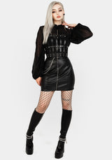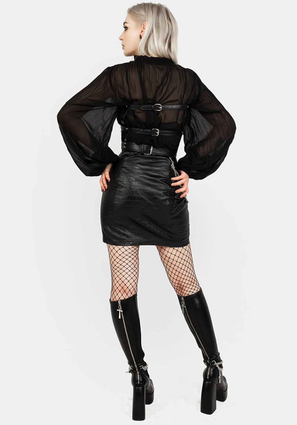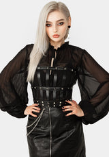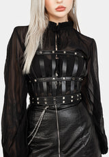 - Caged look formed by vertical straps overlapping three panels & secured by silver rivets