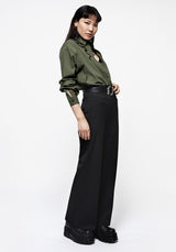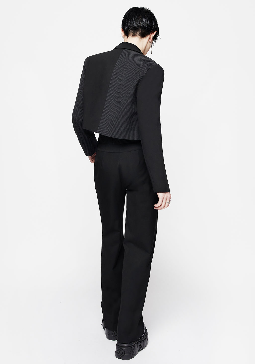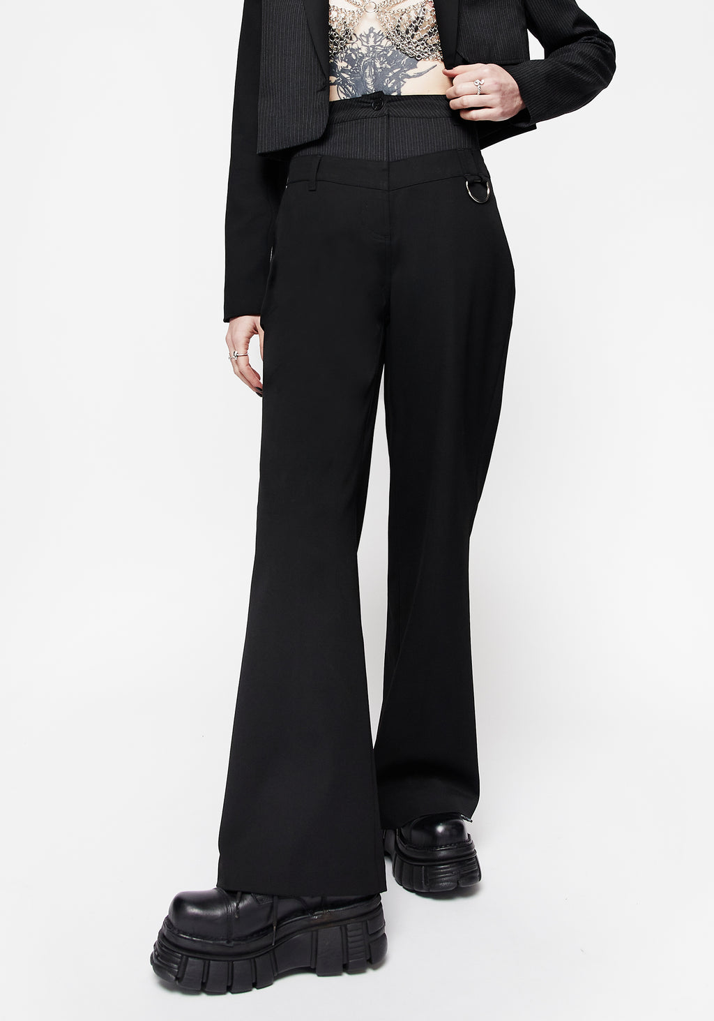 - Black wide leg tailored trousers with pinstripe double waistband detail