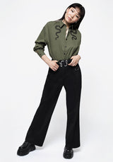 - Silver D-ring detail & handy side seam pockets on (lower) mid-rise waistband