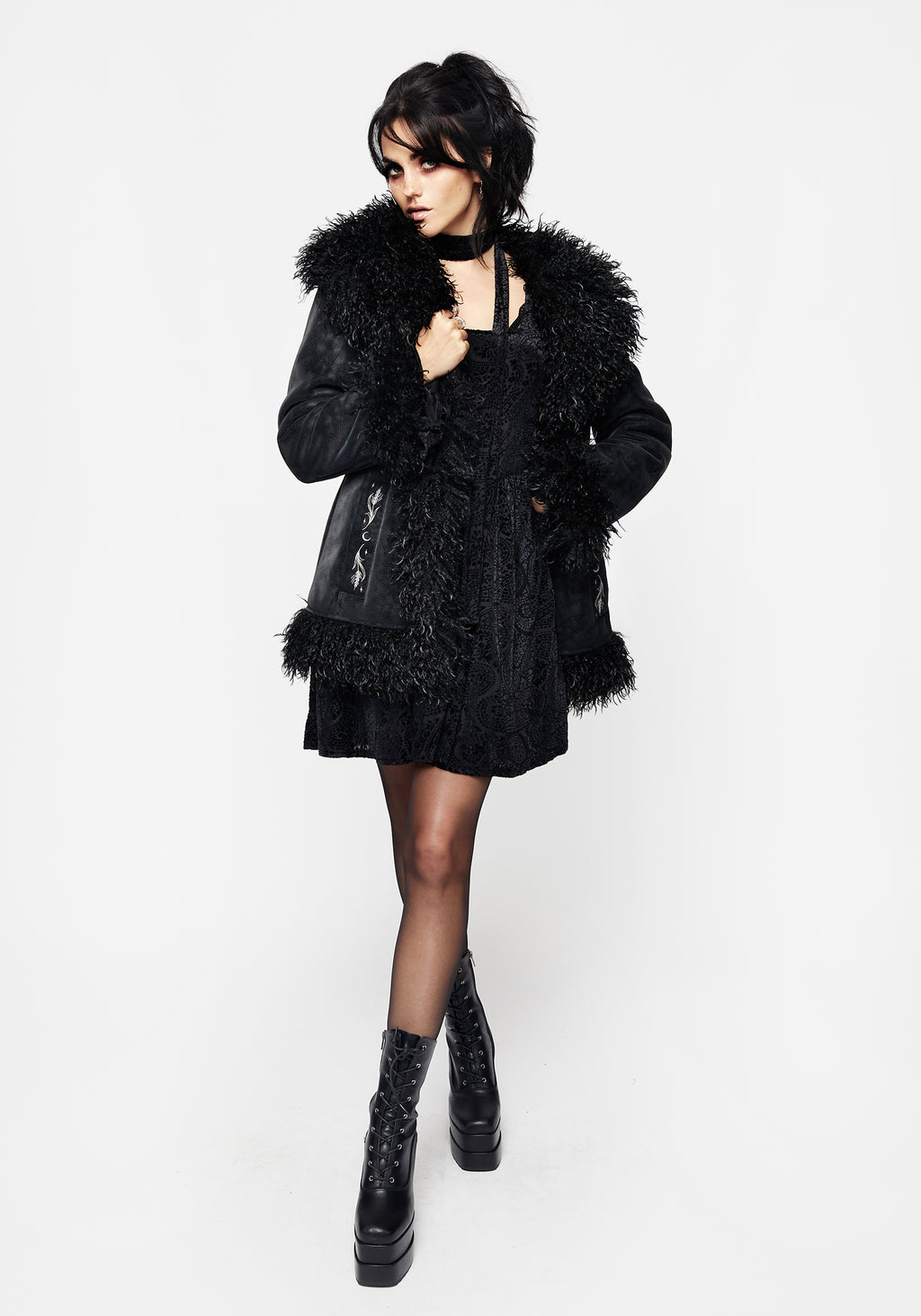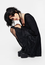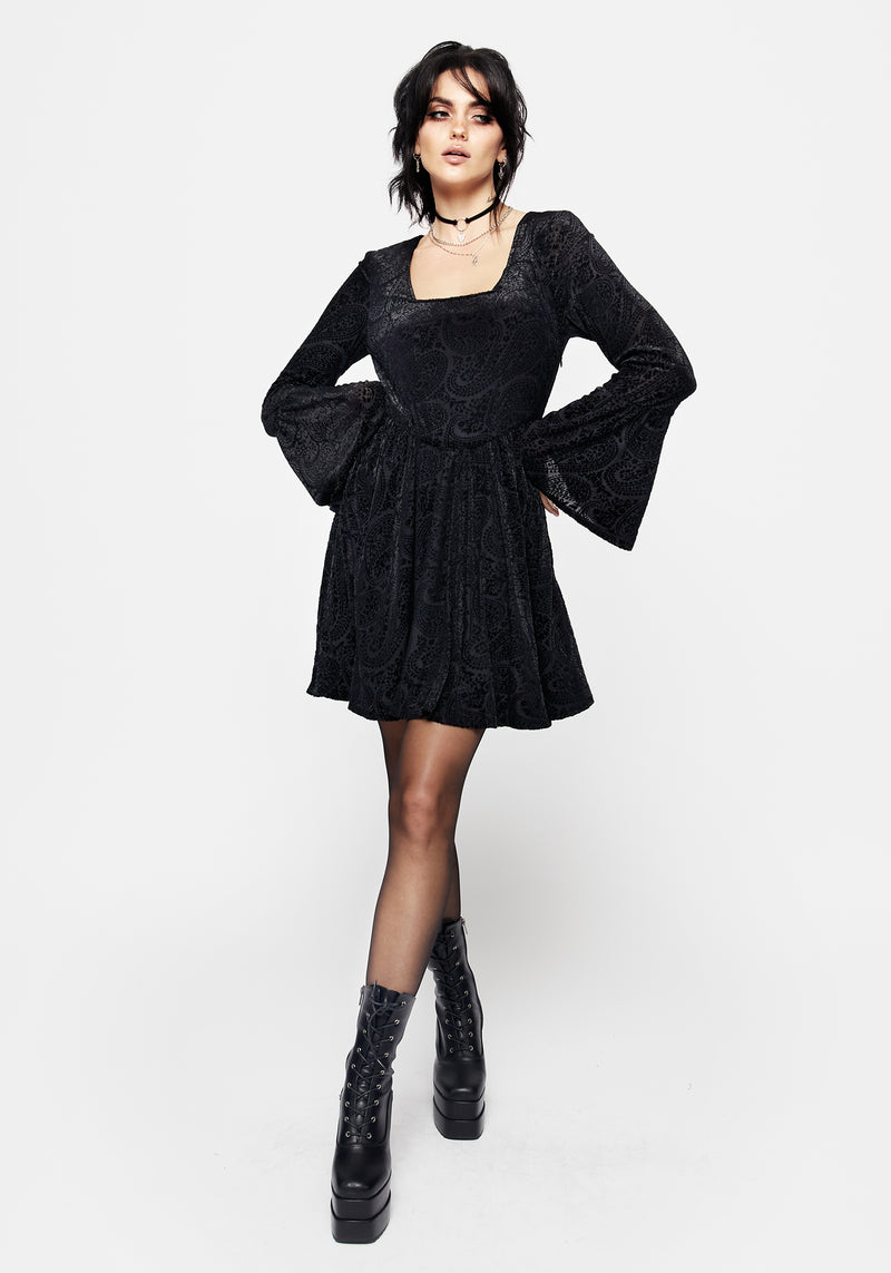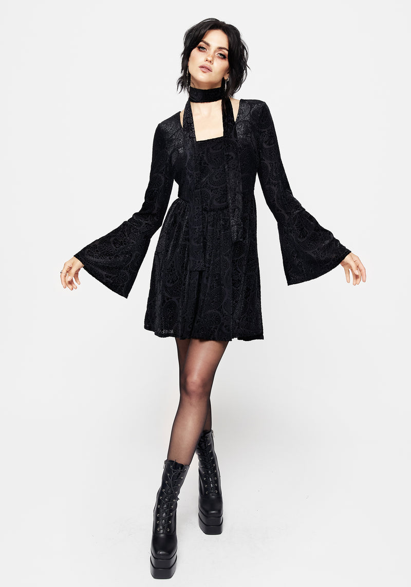 - Black velour devore mesh mini dress with neck wrap