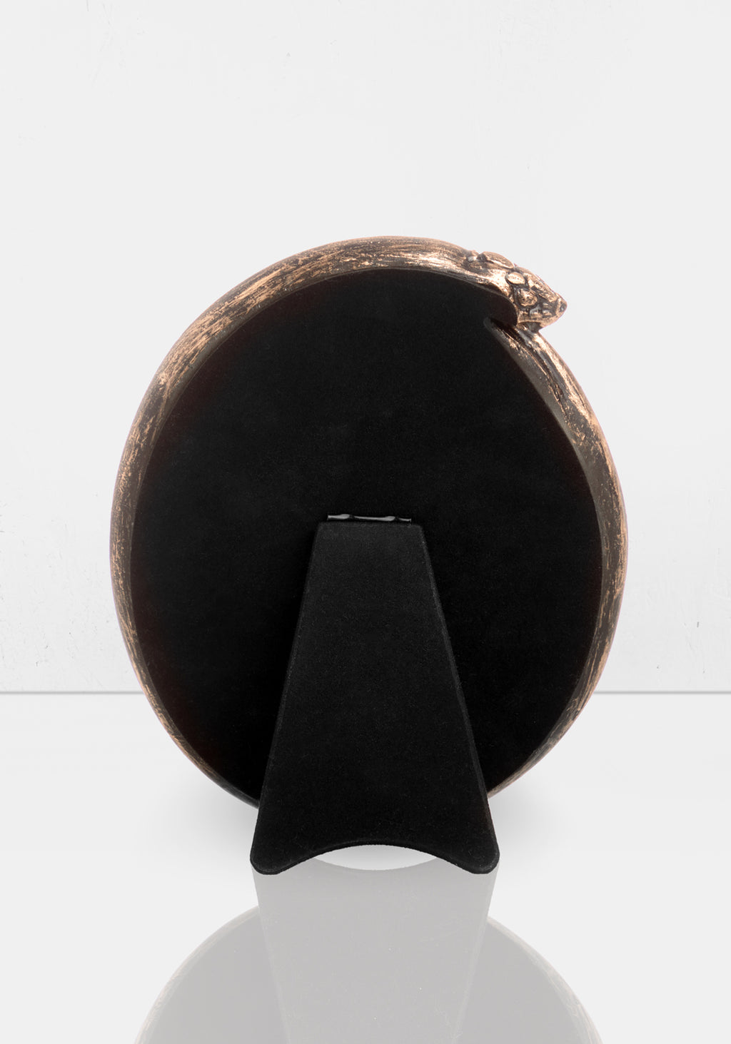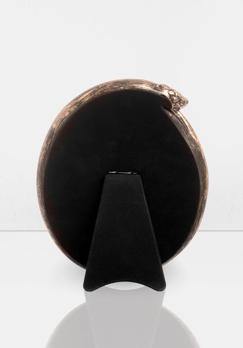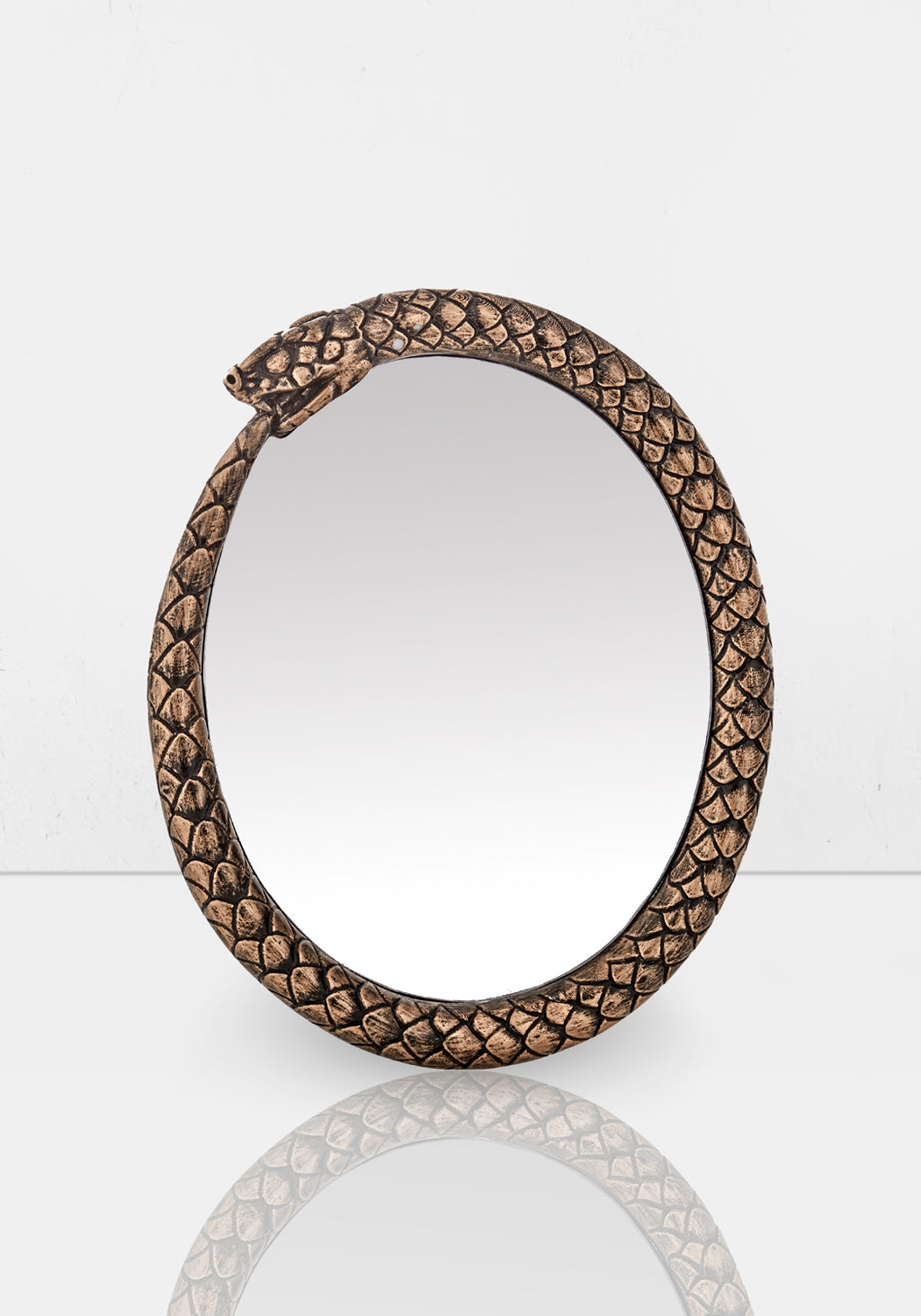 - Ouroboros snake encircles an oval mirror with velvet stand & backing