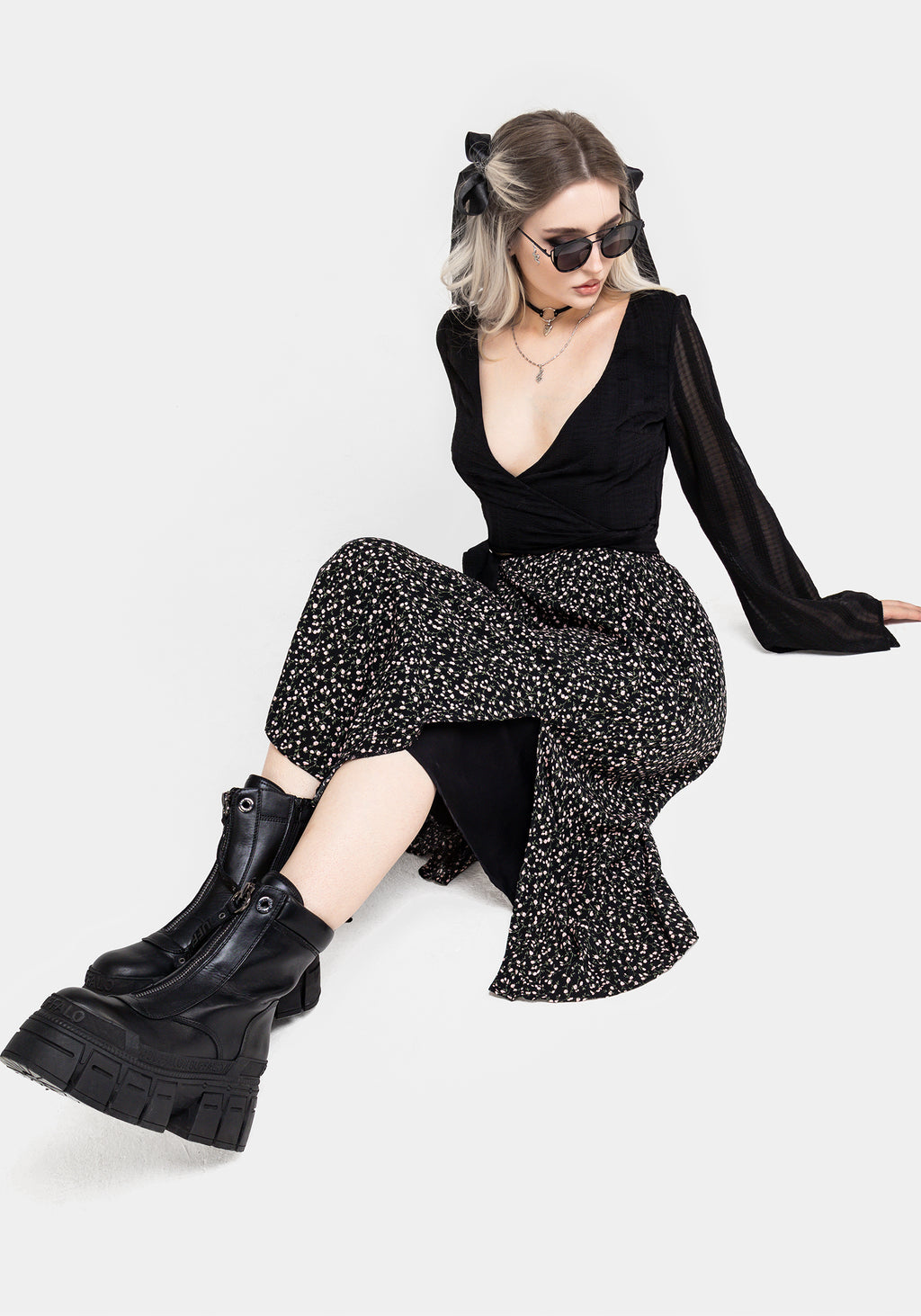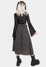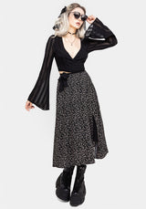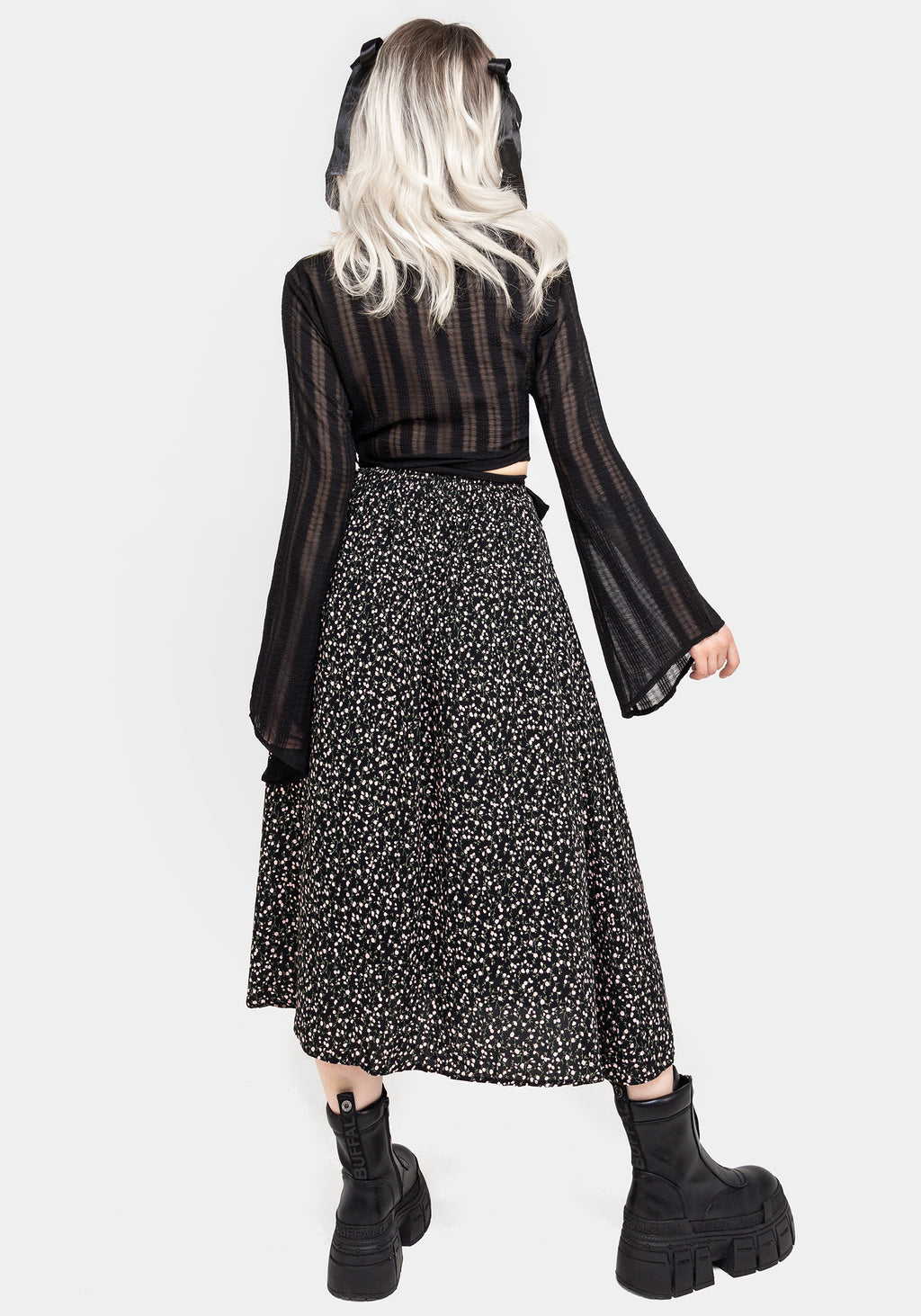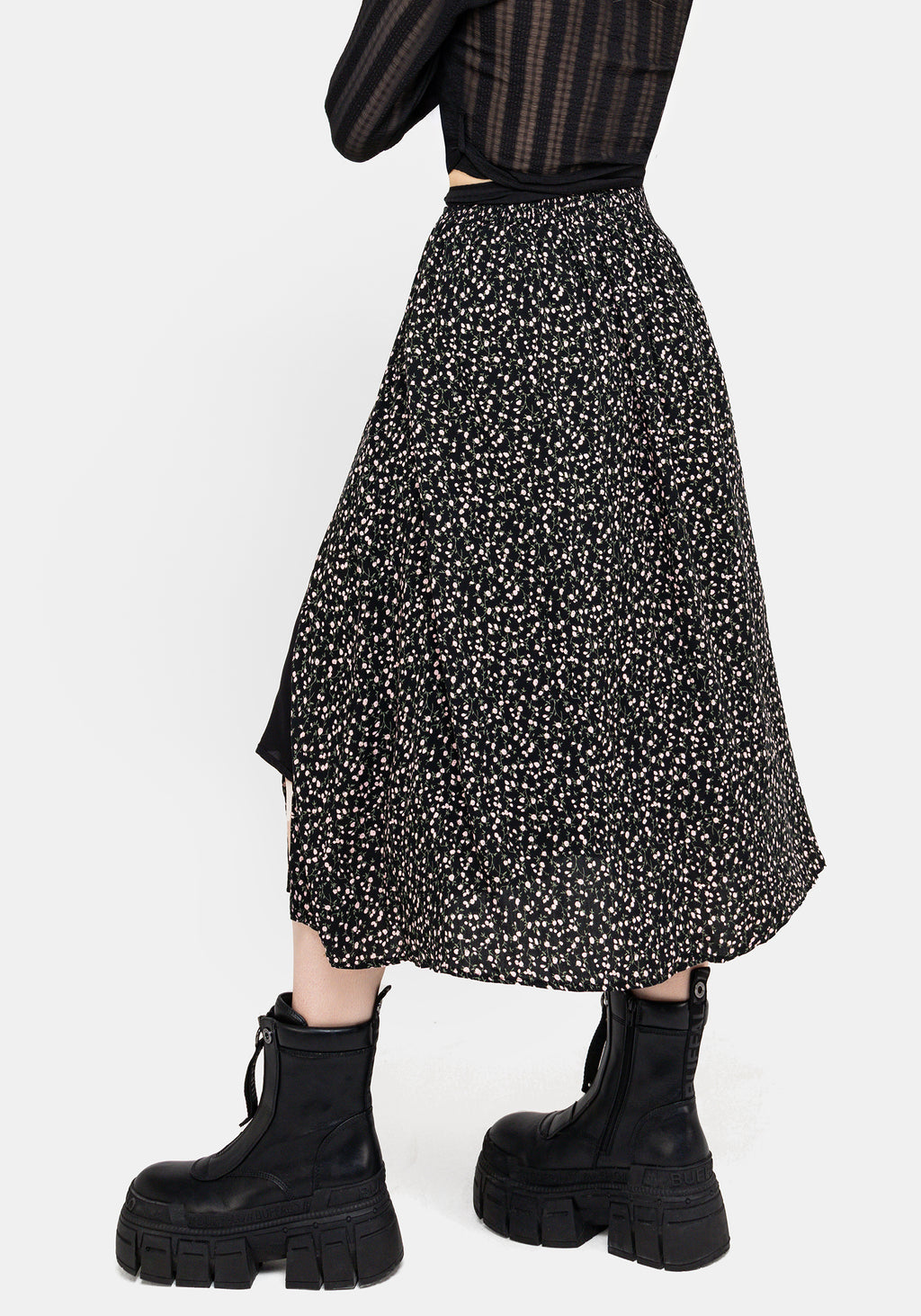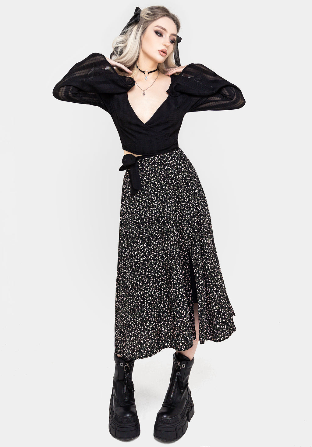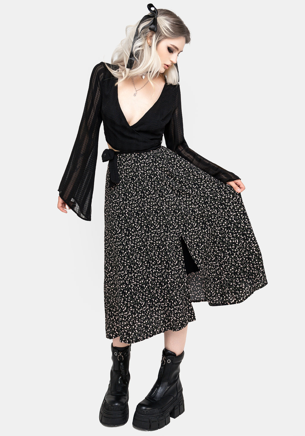 - Flowing midi-length skirt ends mid-calf with a side split to add movement