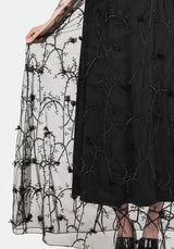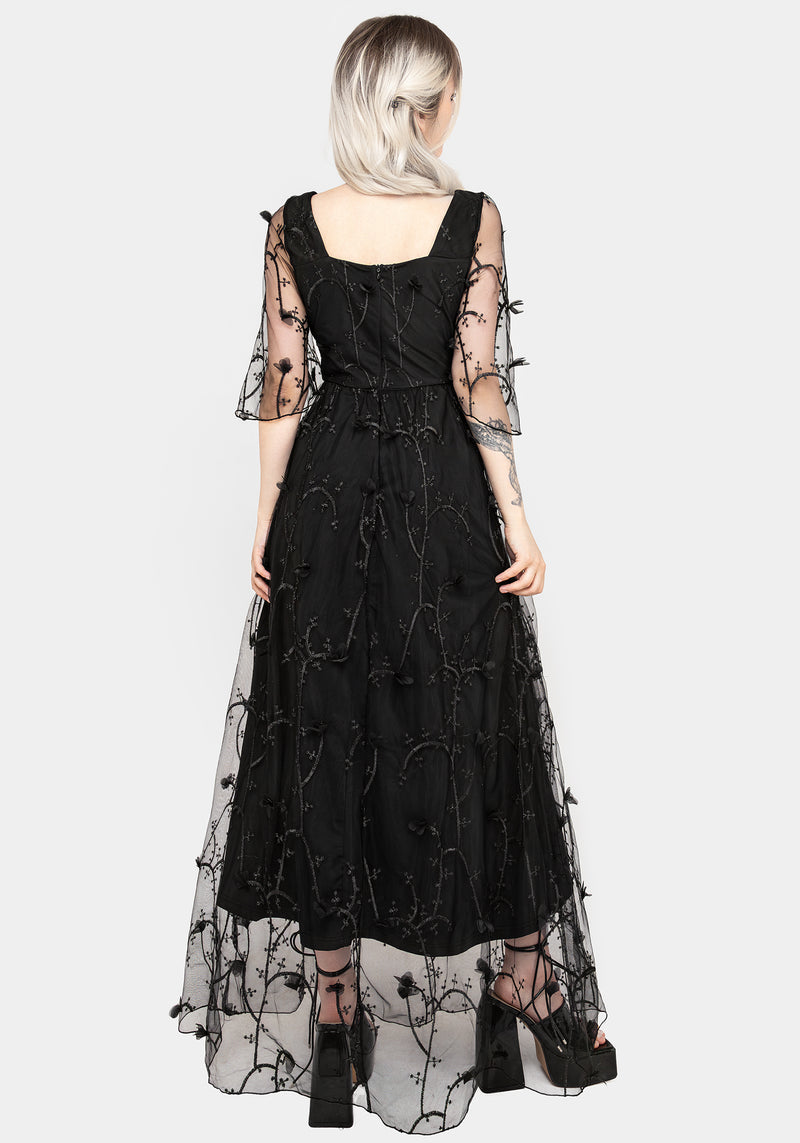 - Ethereal sheer mesh fabrication with delicate floral embroidery
